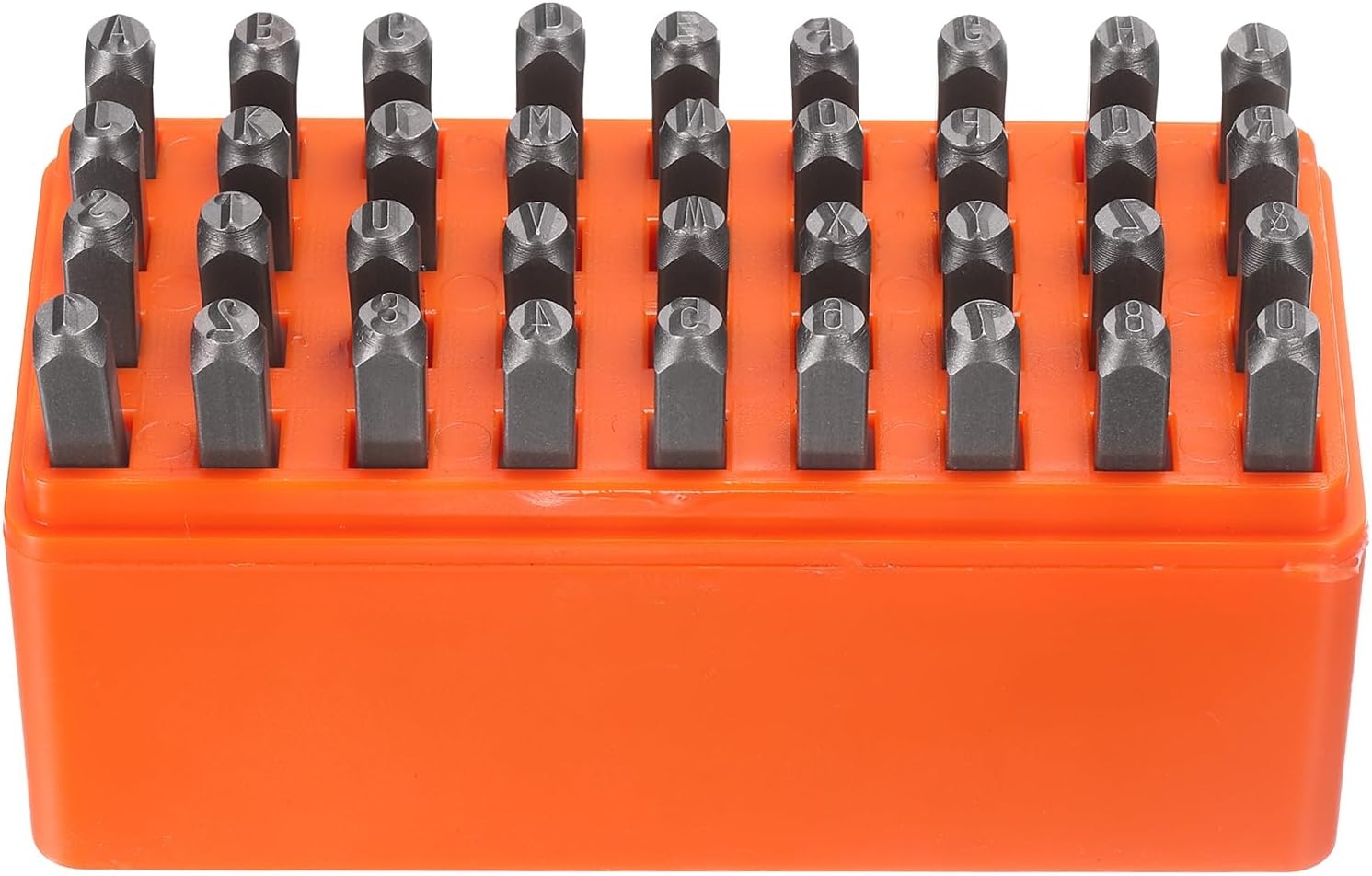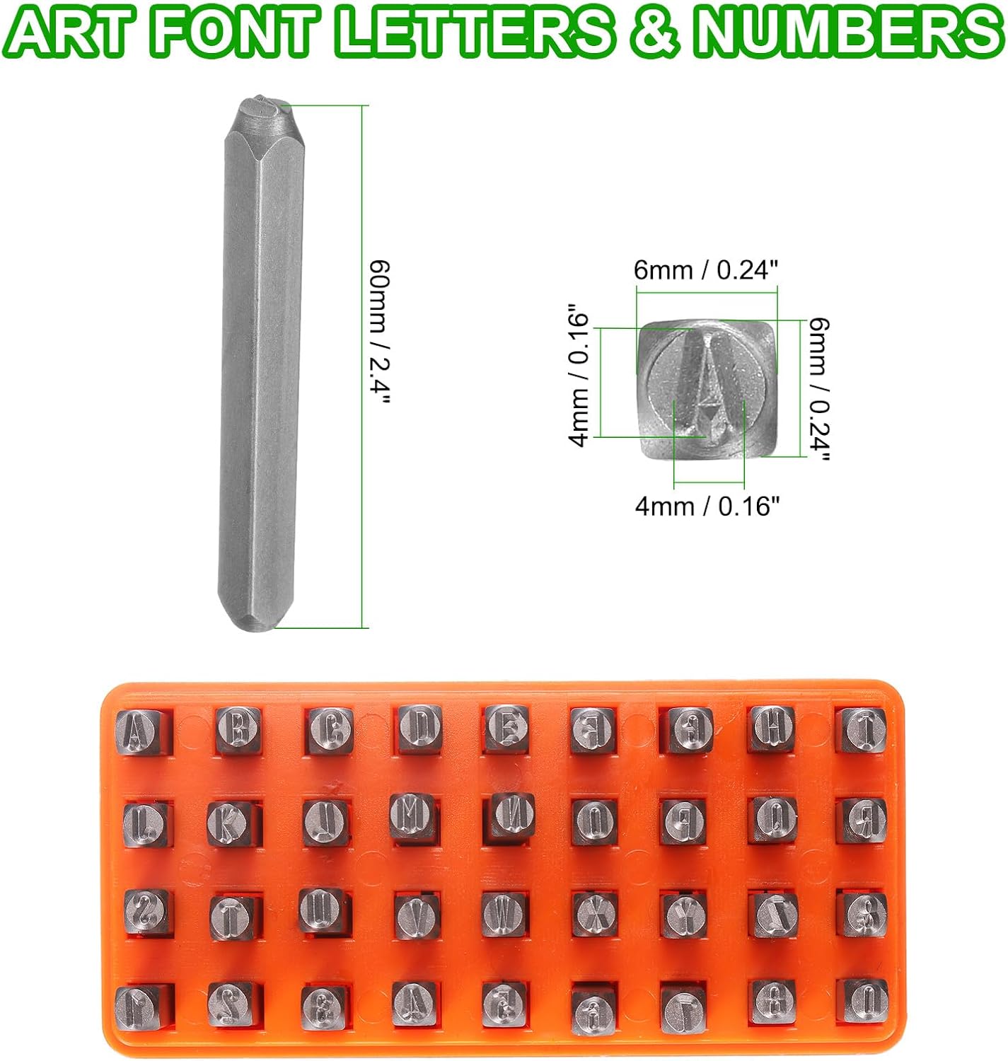 - Size - Letters: 4x4mm / 0.16x0.16 inch (LxW); Steel bars: 60x6x6mmmm / 2.4x0.24x0.24 inch (LxWxH); Package includes: 36 x metal punch stamps (26 uppercase letters from A to Z, numbers from 0 to 8, an '&' symbol, the "6" stamp can be used as a "9")