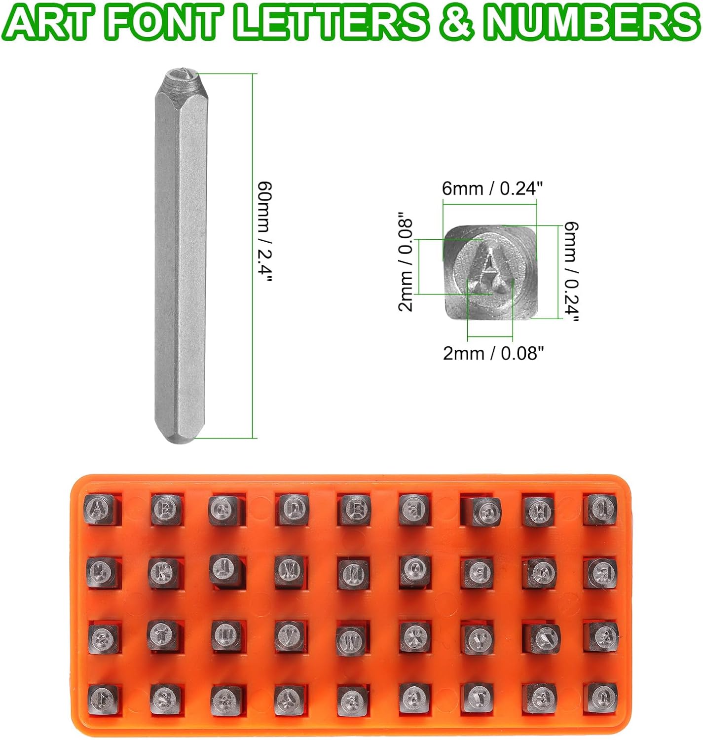 - Size - Letters: 2x2mm / 0.08x0.08 inch (LxW); Steel bars: 60x6x6mmmm / 2.4x0.24x0.24 inch (LxWxH); Package includes: 36 x metal punch stamps (26 uppercase letters from A to Z, numbers from 0 to 8, an '&' symbol, the "6" stamp can be used as a "9")