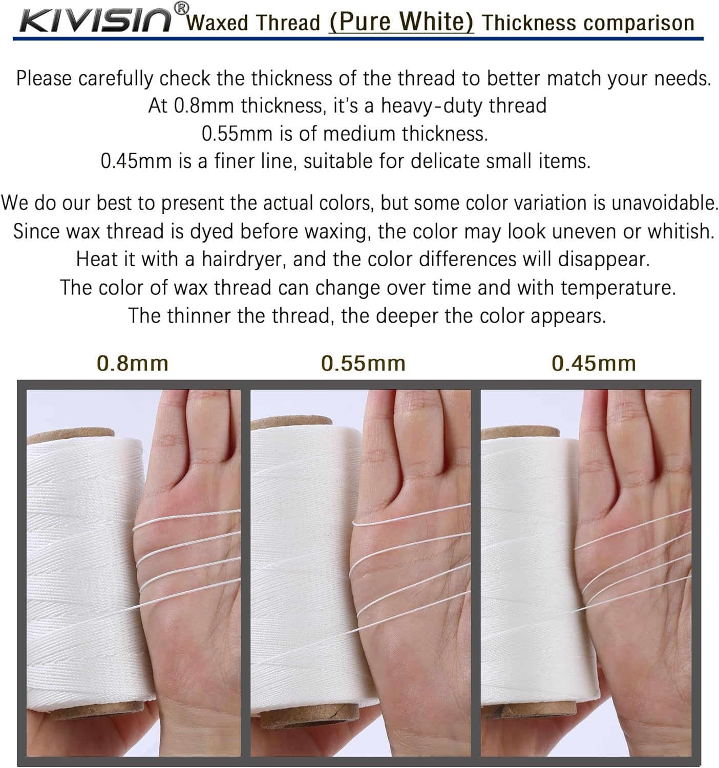- KIVISIN uses high-temperature dyeing for long-lasting color and a high-quality wax blend that evenly penetrates the polyester thread, not just coating the surface. This improves durability, smoothness, prevents tangling, and reduces fiber breakage. During jewelry making, heat can be used to remove the wax, making the color more vibrant