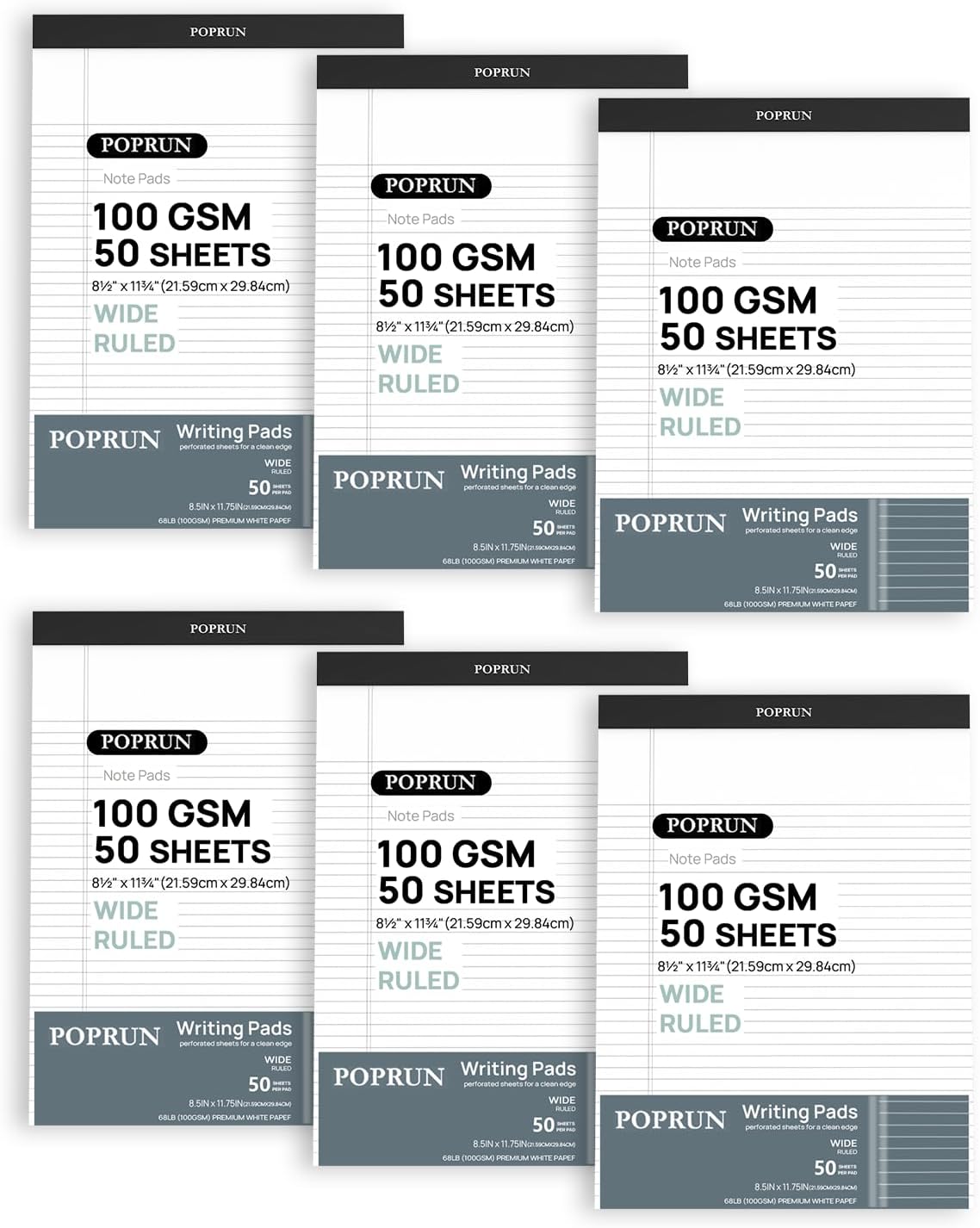 POPRUN White Legal Pads 8.5 x 11.75 Wide Ruled, 100GSM Writing Paper Pad, Bulk Lined Notepad Notebooks for Work School, Classroom Office Supplies, 6 Pack
