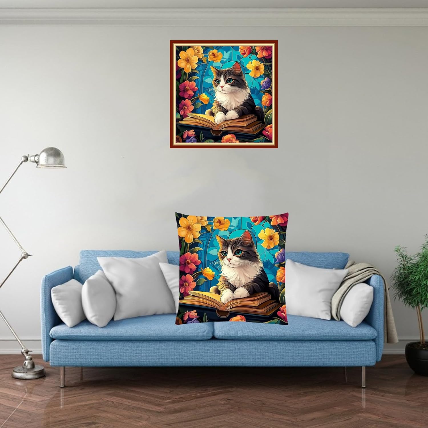 Fanxvivy Stamped Cross Stitch Kits for Adults Beginners Pillow Needlepoint Kit with Embroidery Pattern Needlework Kit Prestamped Stitches Kit 11CT Cross Stitching-Cat Flowers 18x18 inchs