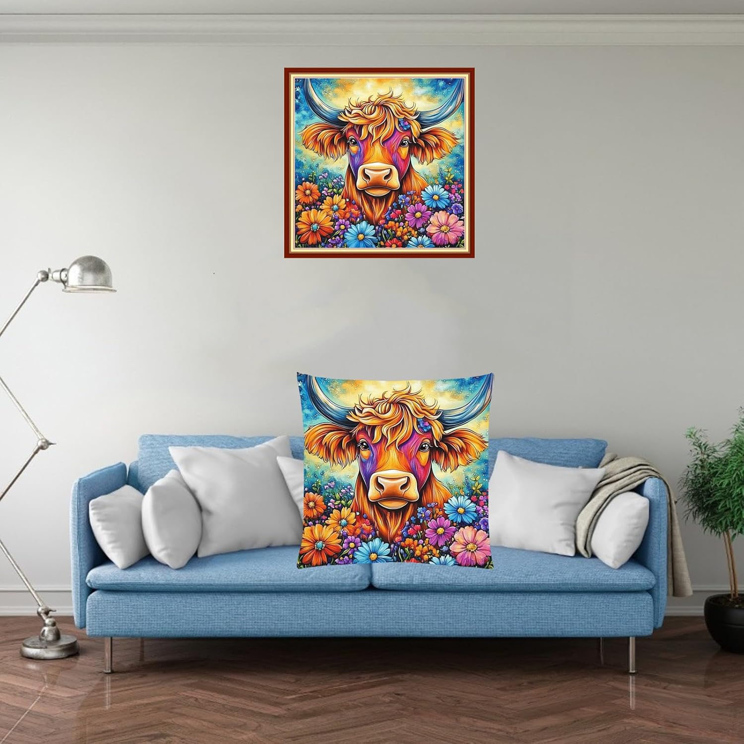 Fanxvivy Stamped Cross Stitch Kits for Adults Beginners Pillow Needlepoint Kit with Embroidery Pattern Needlework Kit Prestamped Stitches Kit 11CT Cross Stitching-Colorful Cow Flowers 18x18 inch