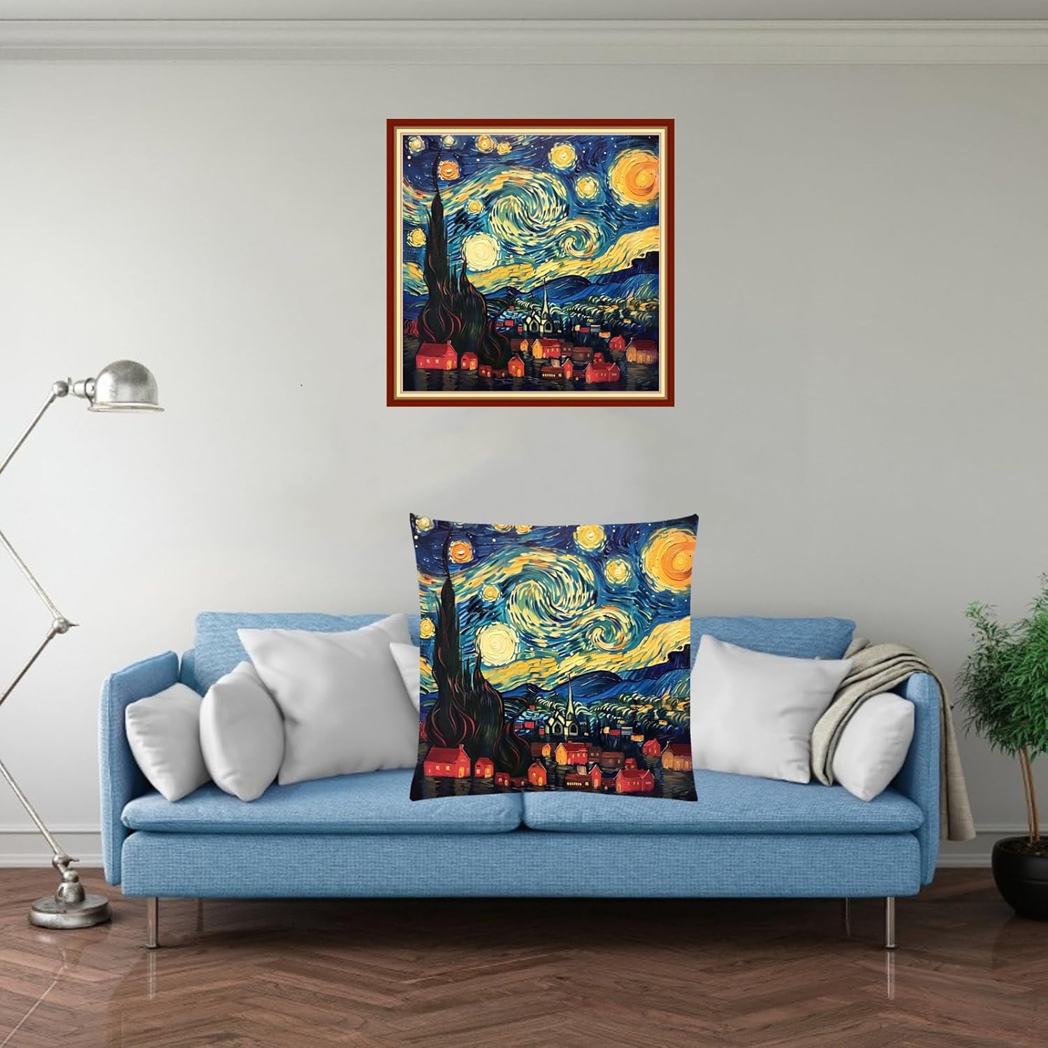 Stamped Cross Stitch Kits for Adults Beginners Pillow Needlepoint Kit with Embroidery Pattern Needlework Kit Prestamped Stitches Kit 11CT Cross Stitching-Van Gogh Starry Sky Home 18x18 inch