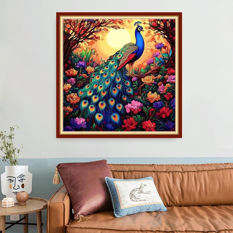 Foxhool Beginners Cross Stitch Kits Stamped Full Range of Embroidery Kits for Adults DIY Cross Stitches kit Embroidery Patterns for Needlepoint kit-Peacock Flower 18x18 inch