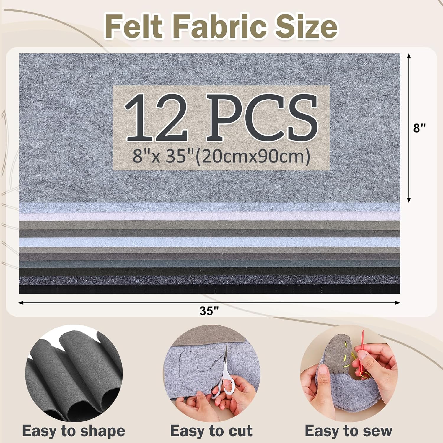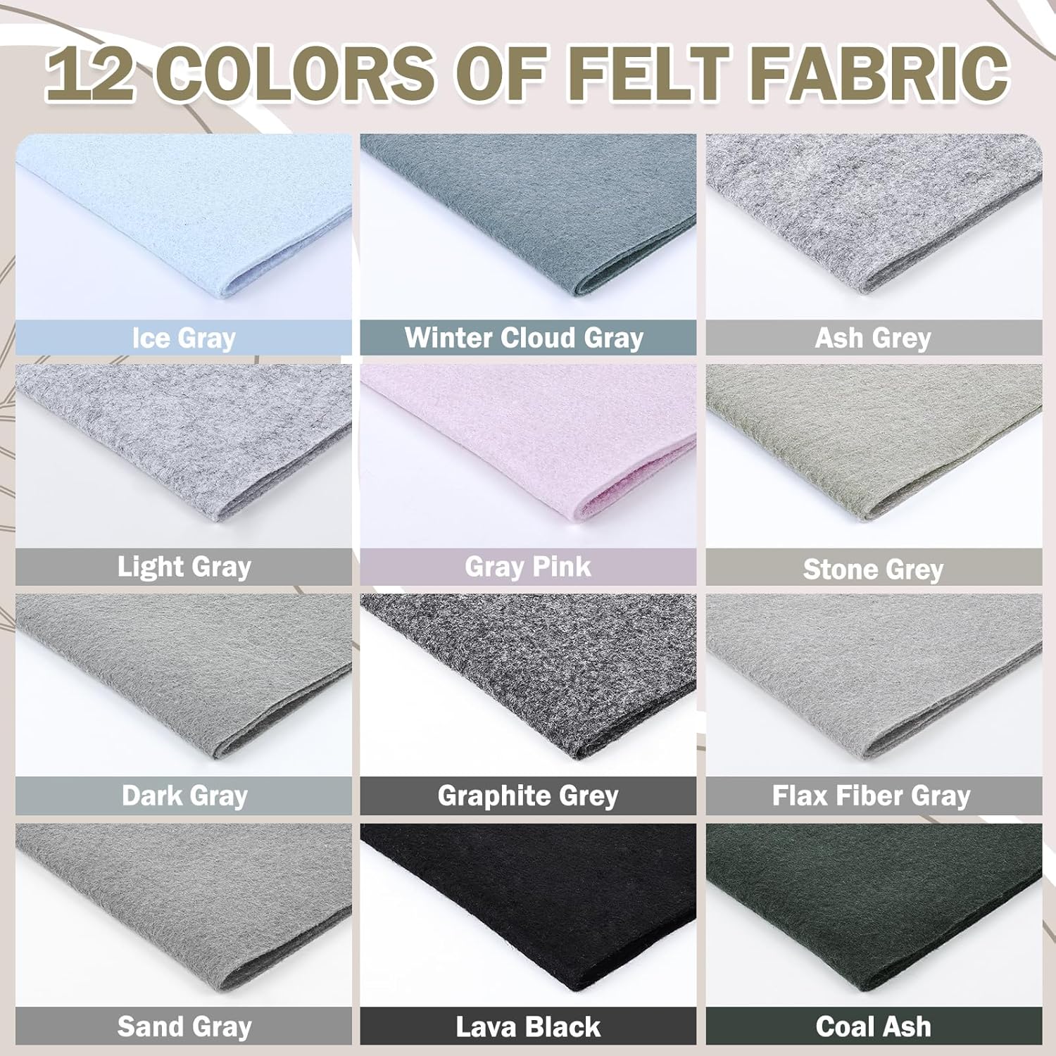 - 【White Grey Series Felt Fabric】:Our felt fabric portfolio contains 12 White Grey series colors, the size of each roll is 8 "x35"(20.5x90cm) and the thickness of the felt is about 1.4mm. These craft felt are Thick and light tight, it can withstand prolonged use without wear or tear.
