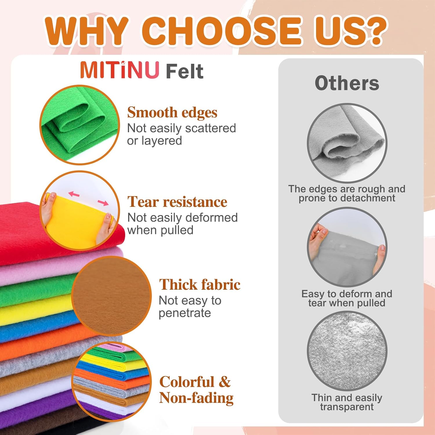 - 【High Quality】:Crafted from high-quality raw materials, this felt boasts a dense texture, exceptional durability, and resistance to deformation. Its smooth surface, fray-resistant edges, and plush softness ensure effortless cutting and sewing, while every detail reflects our rigorous commitment to quality.