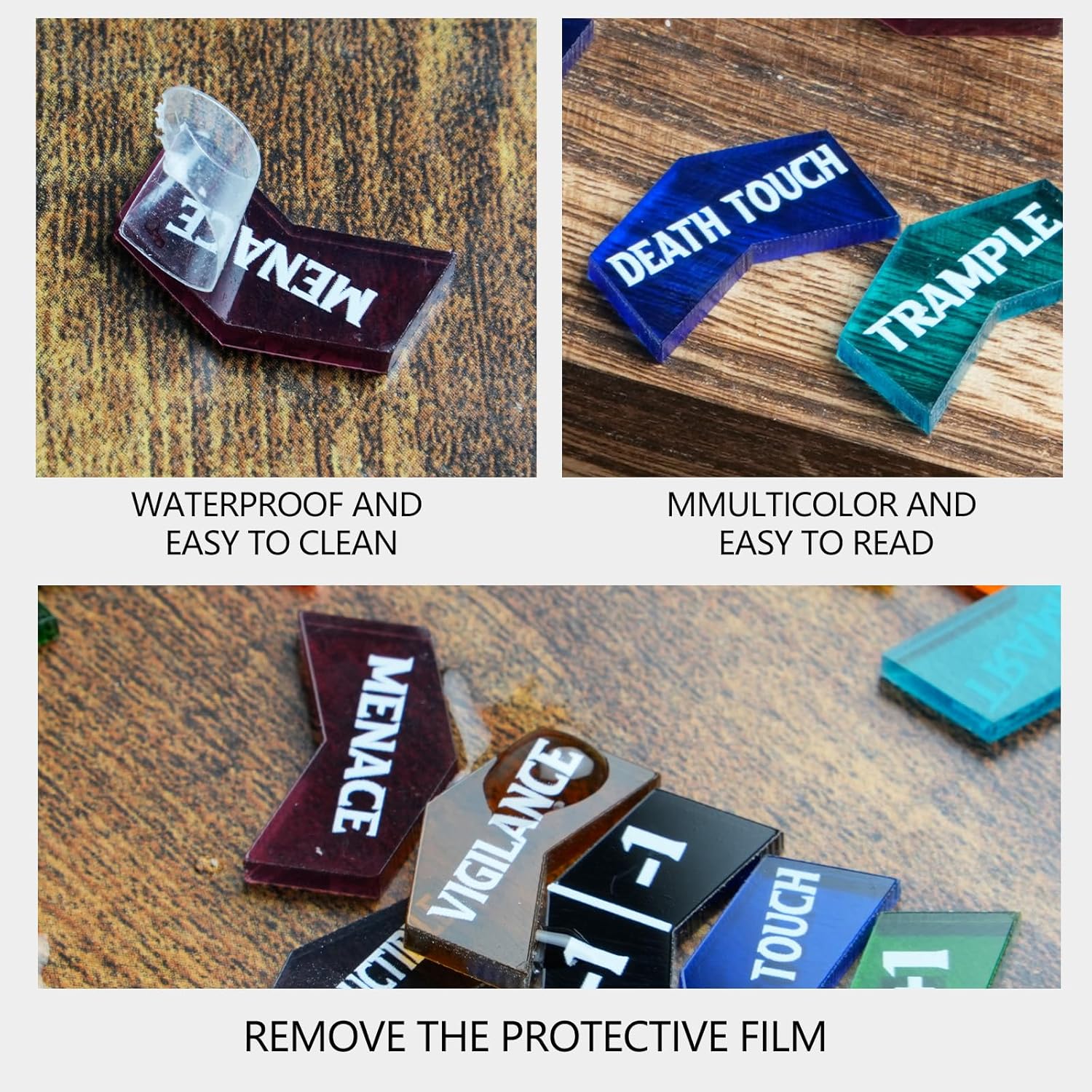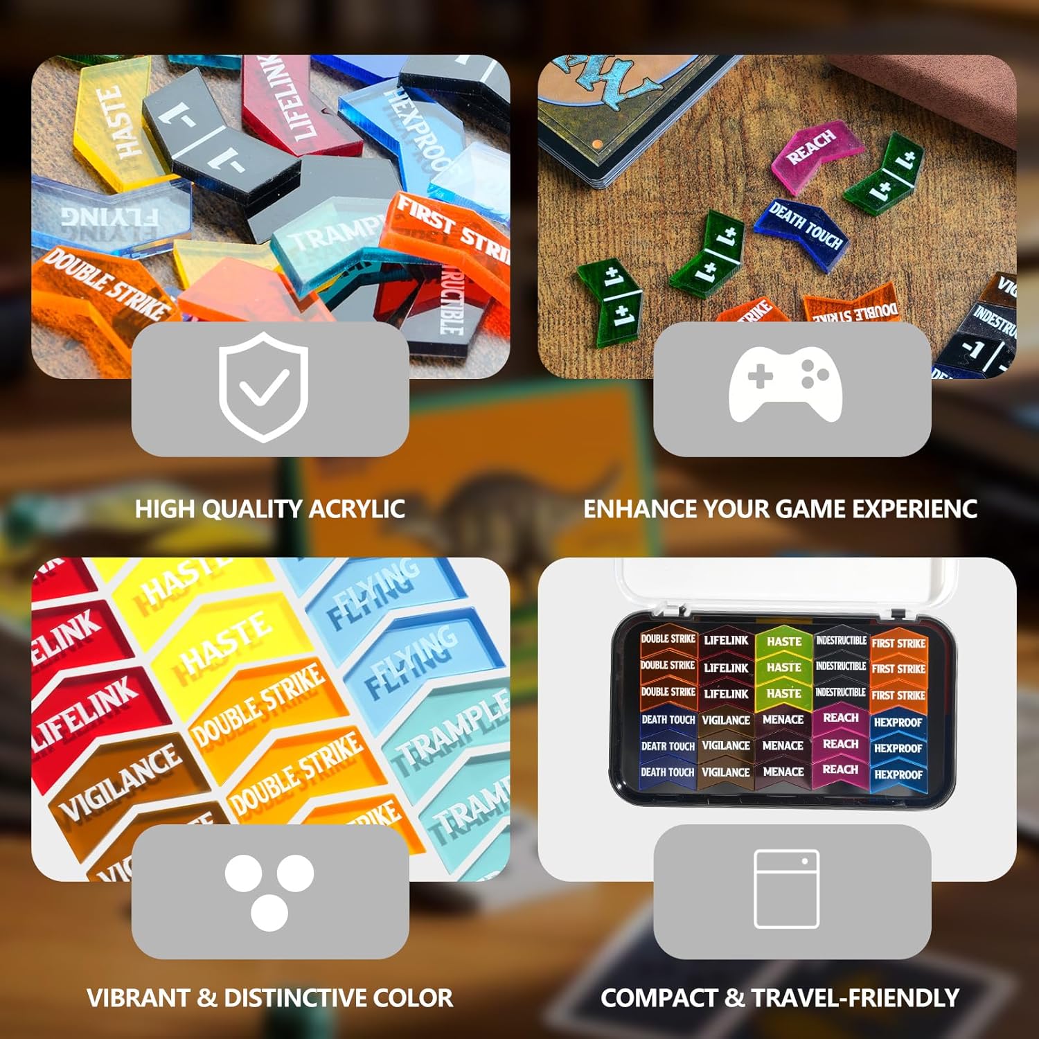 - Package Include: Total 60PCS MTG Colored Tokens, Includes 12 different keyword with 3 MTG tokens each, (FIRST STRIKE,VIGILANCE,MENACE,TRAMPLE,HASTE,DOUBLE STRIKE, LIFELINK,REACH,FLYING,HEXPROOF,DEATHTOUCH, INDESTRUCTIBLE),and 24pcs counters(12 pieces -1/-1counters & 12 pieces +1/+1 counters) with box