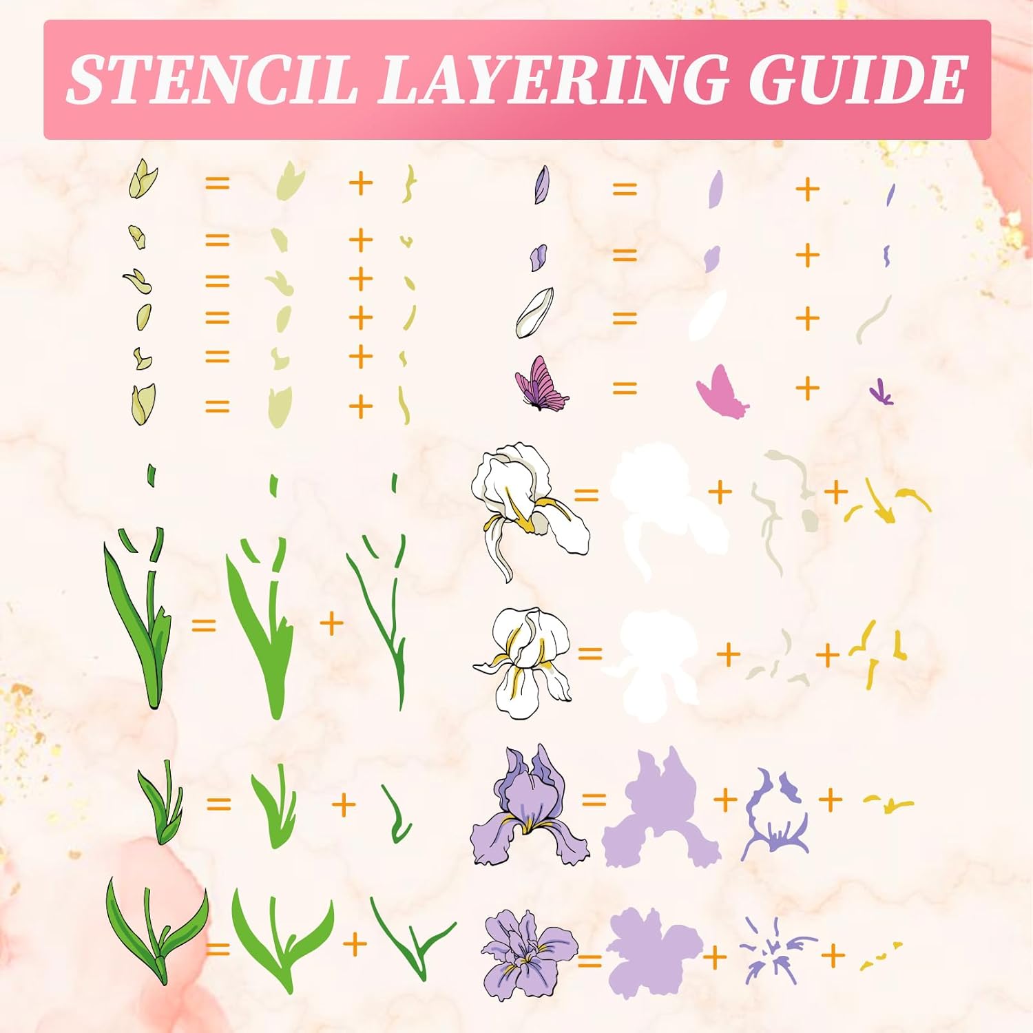 - Realistic Iris DIY Set: Create iris flowers with stamps layering stencils and cutting dies. Stamp floral outlines, layer colors using PET stencils, then cut designs effortlessly. Perfect for decorating cards, scrapbooks, and crafts