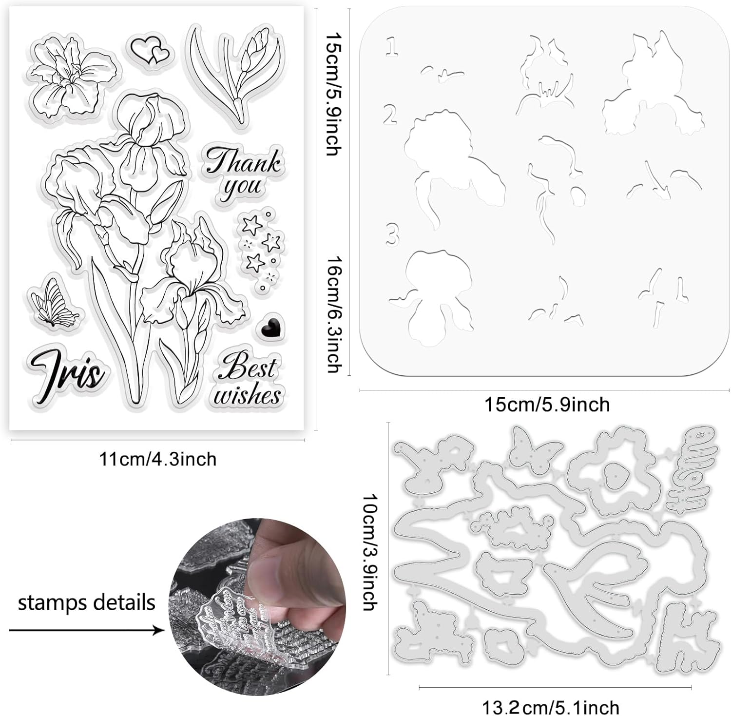 - Package Includes: You will receive 1 sheet clear stamps(6.3x4.33inch)with Iris and leaves, 1 set cut dies for cutting flowers and leaves, and 1 pc PET stencil(5.9x5.9inch) for creating color layering effects. The whole set can meet your DIY craft needs