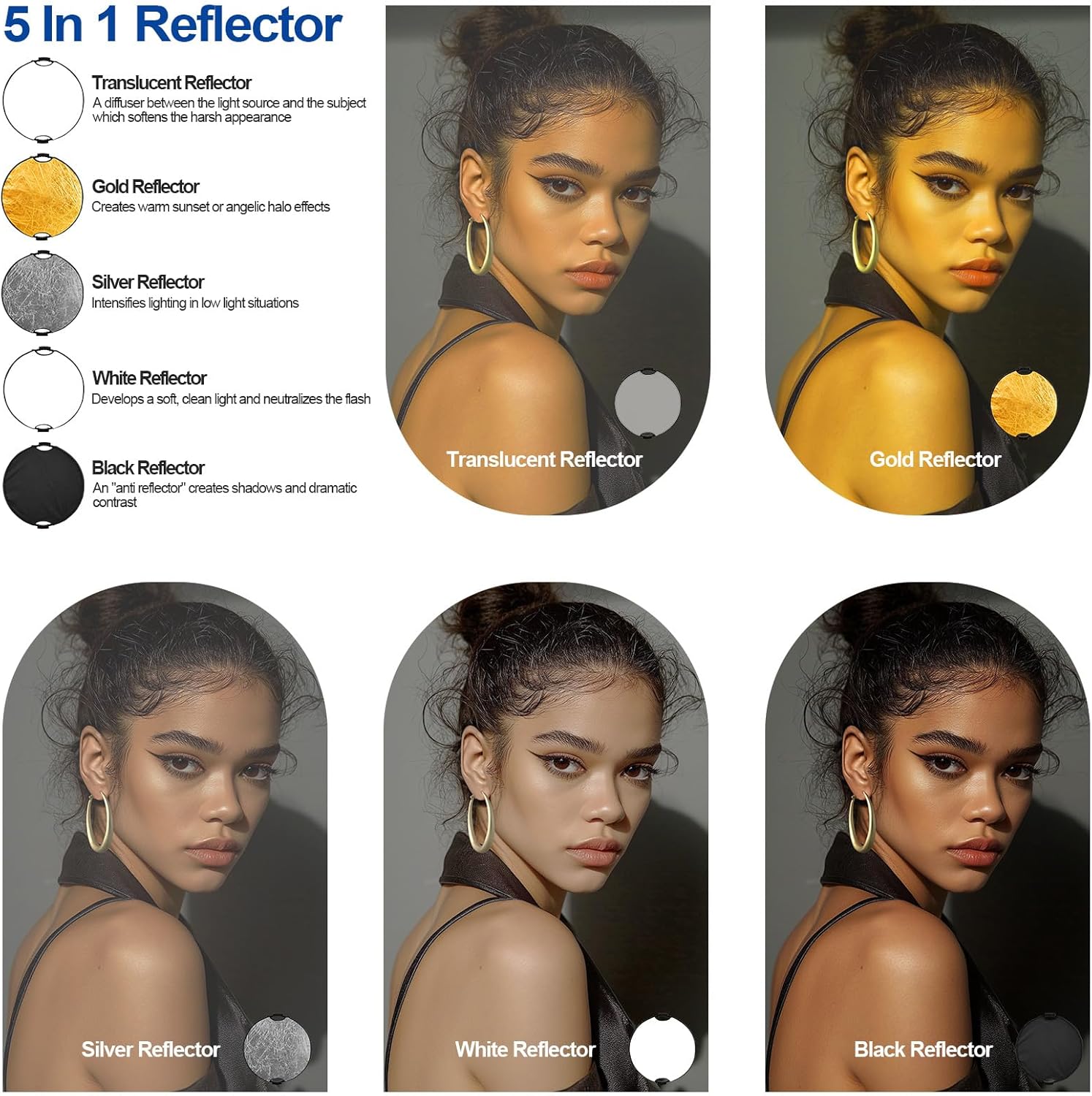 - 【COMPLIMENTARY FUNCTION, WORRY-FREE CREATIVITY】: The 32-inch / 80 cm 5-in-1 reflector with five different reflective surfaces, silver, gold, white, black and translucent, can achieve a variety of light effects to meet the needs of different scenarios. Adjustable light stand folding height of 18.3 inches / 465 mm, maximum height of 70.86 inches / 1800 mm, minimum height of 18.5 inches / 470 mm, to provide stable support, and its height and angle can be flexibly adjusted, and with the reflector, so that the light and the shooting angle is a perfect match, whether it's indoor portraits, outdoor landscapes, live broadcasts, video creation, can easily cope with.
