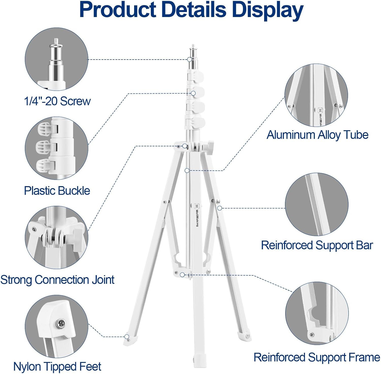 - 【STANDARD TRIPOD MOUNT】1/4" screw tip on the stem and plastic screw protection are suitable for most ring lights and also for most photographic equipment. Rubber cover at the end of the feet, increase the friction with the floor.The white color is simple, elegant and visually refreshing.