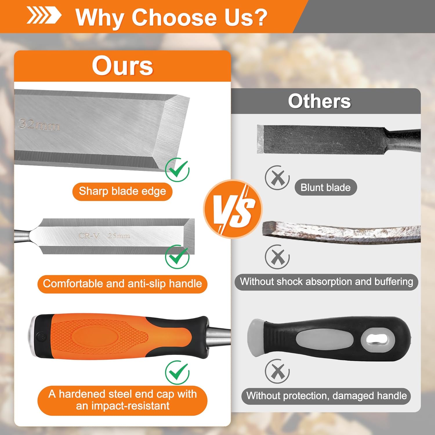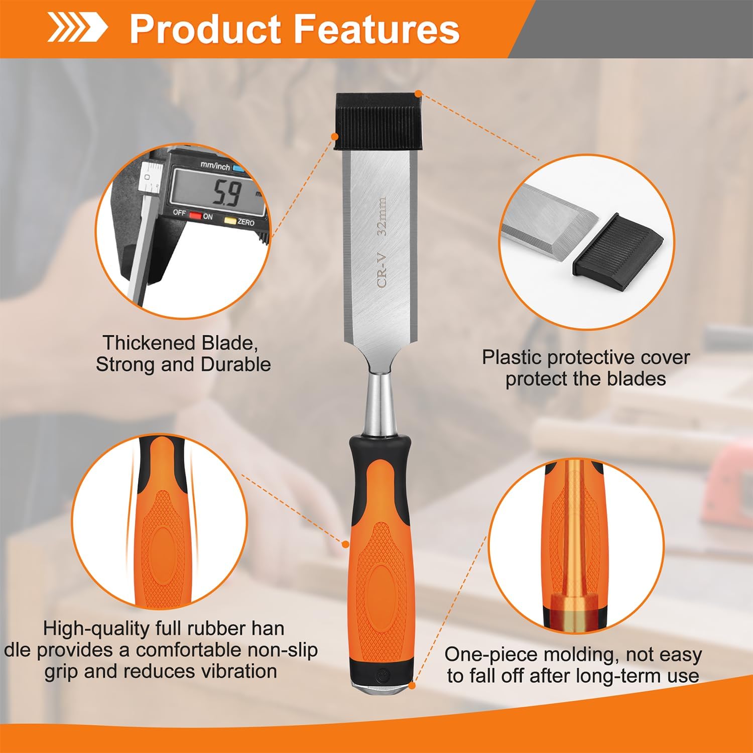 - 【Premium Quality & Durability】Crafted from sturdy carbon steel with high-quality rubber handles, these chisels feature sharp, long-lasting bevel blades that work on softwood, hardwood, and laminated wood. rhe handle and blade are securely connected for long-term use. Each chisel has its own protection cap to cover the sharp blades when you finish working.