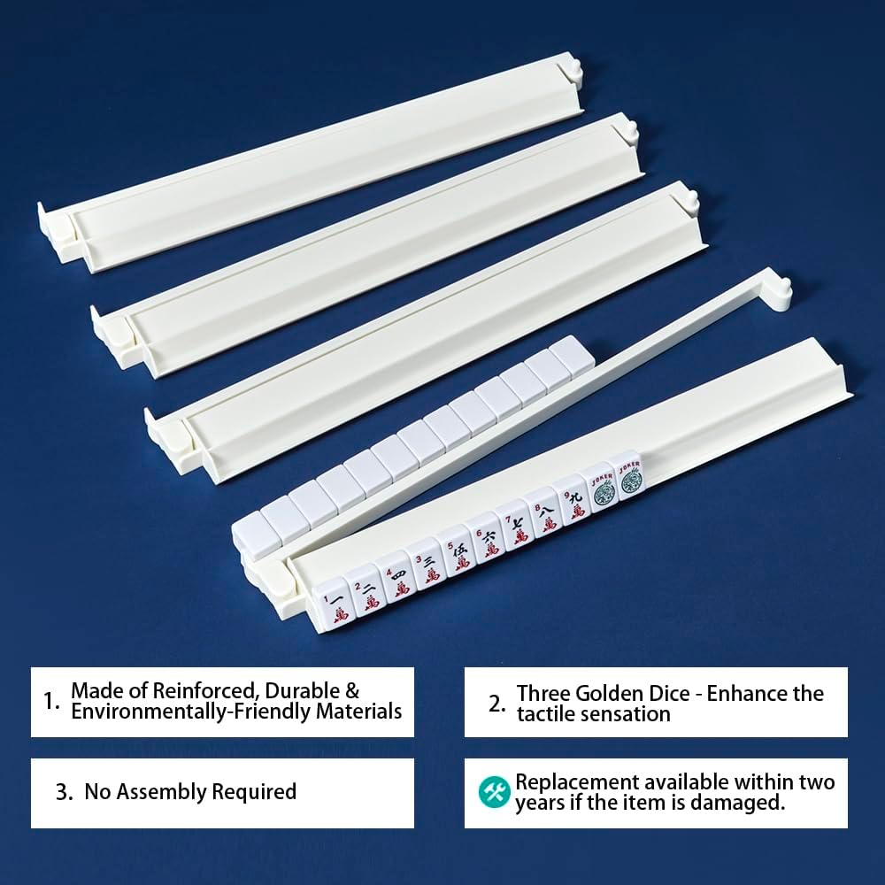 - Compact Racks with Pushers: 4 of Mahjongg rack and pusher are user-friendly, perfectly connected and do not require assembly. This set is designed to make it easy for you to hold the tiles and push the tiles walls into place.