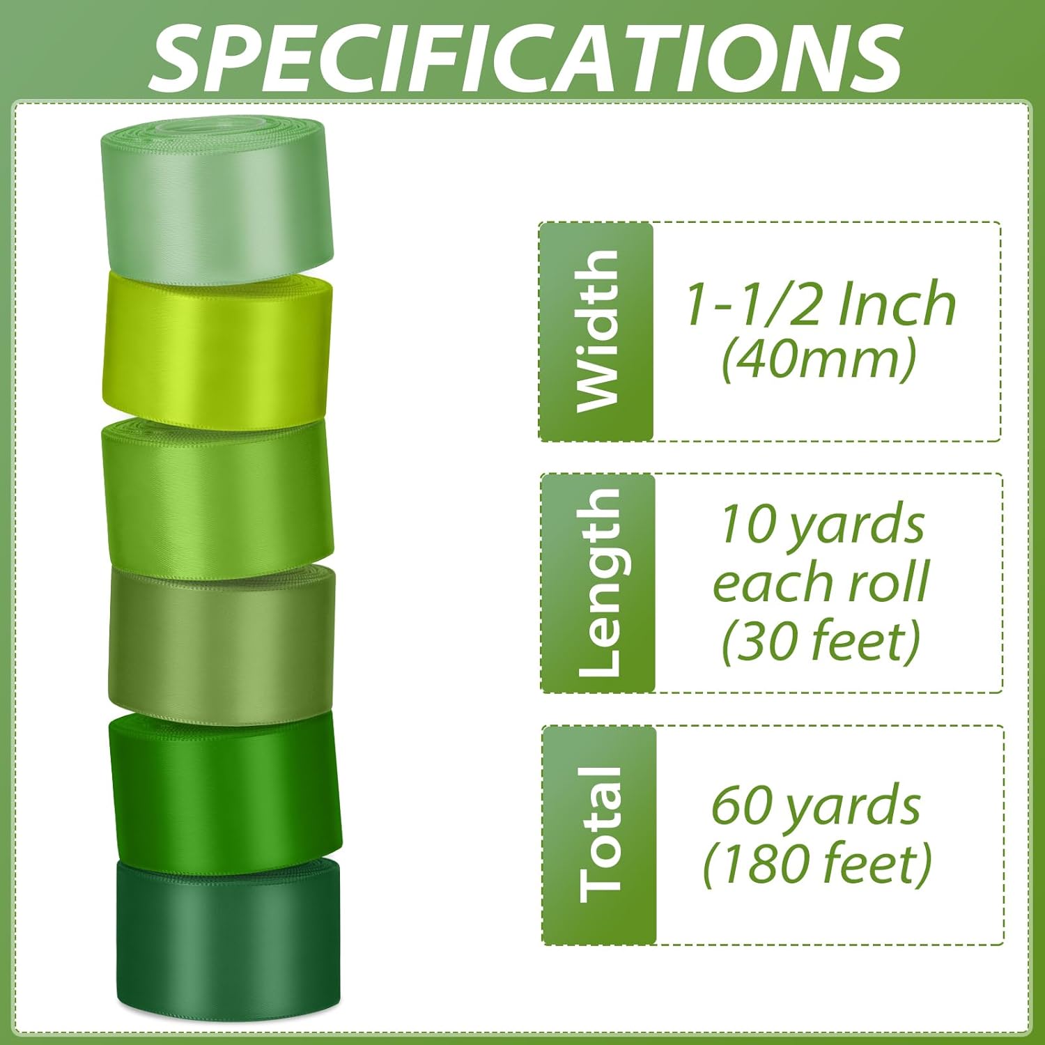 - 【What's Include】:6 rolls 1-1/2 inch wide single-faced green ribbon measures 10 yards (30 feet) each roll, 60 yards (180 feet) in total
