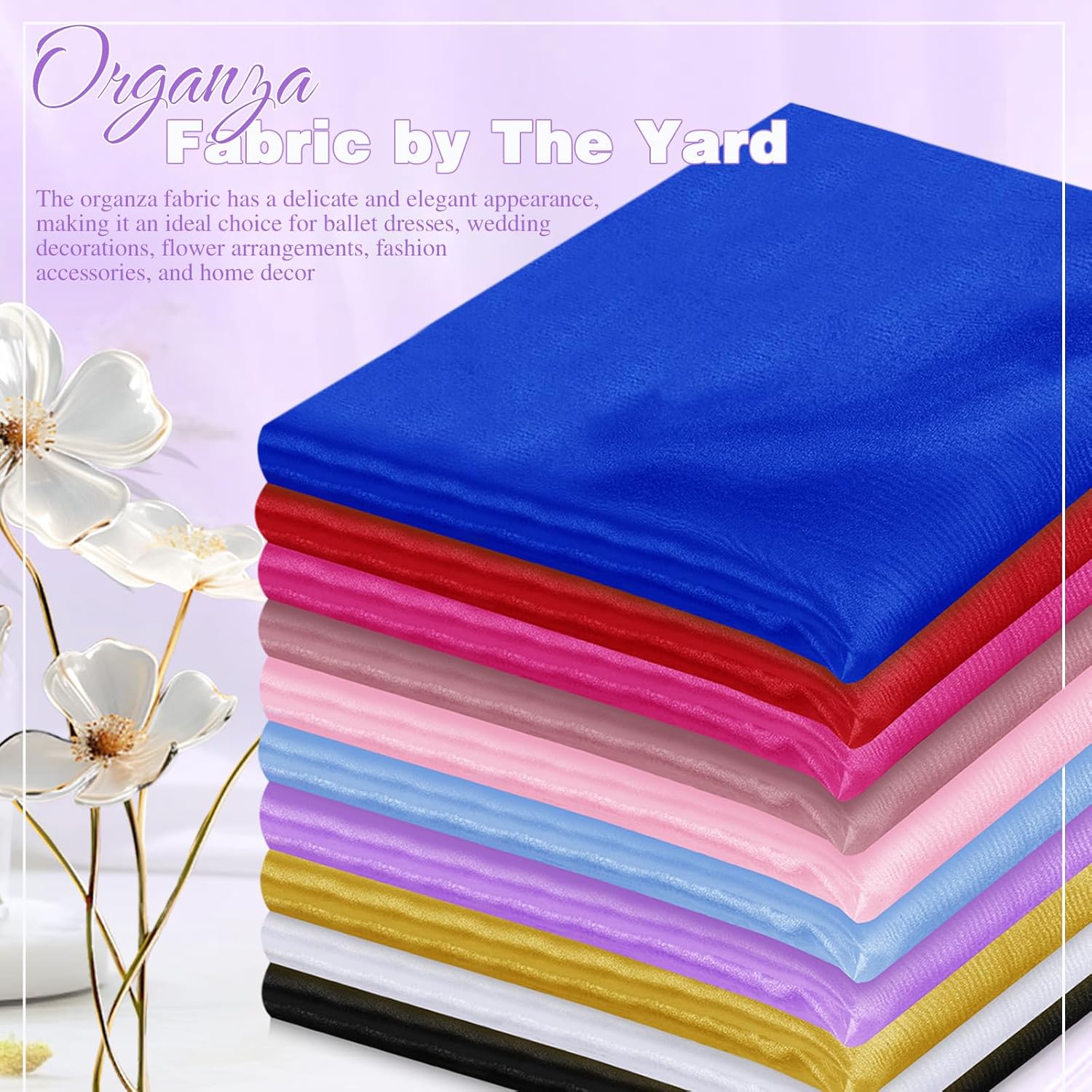 - What Will You Receive: 10 yards organza fabric (Pre-cut), Size: 360 x 60 Inch (L*W). Available Color: Gold, White, Royal Blue, Rose Gold, Black, Red, Hot Pink, Light Pink, Light Purple, Light Blue. You can give full play to your handicraft ability and creativity