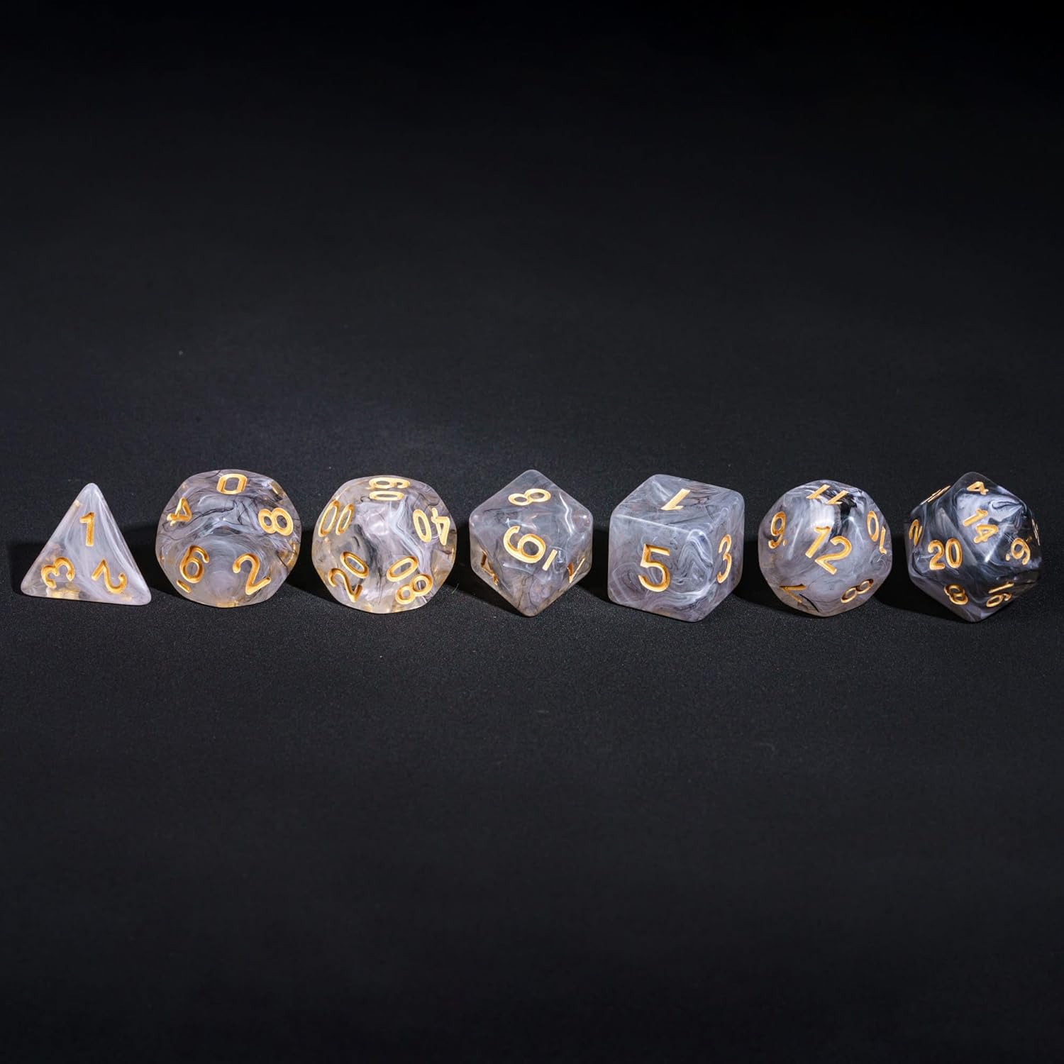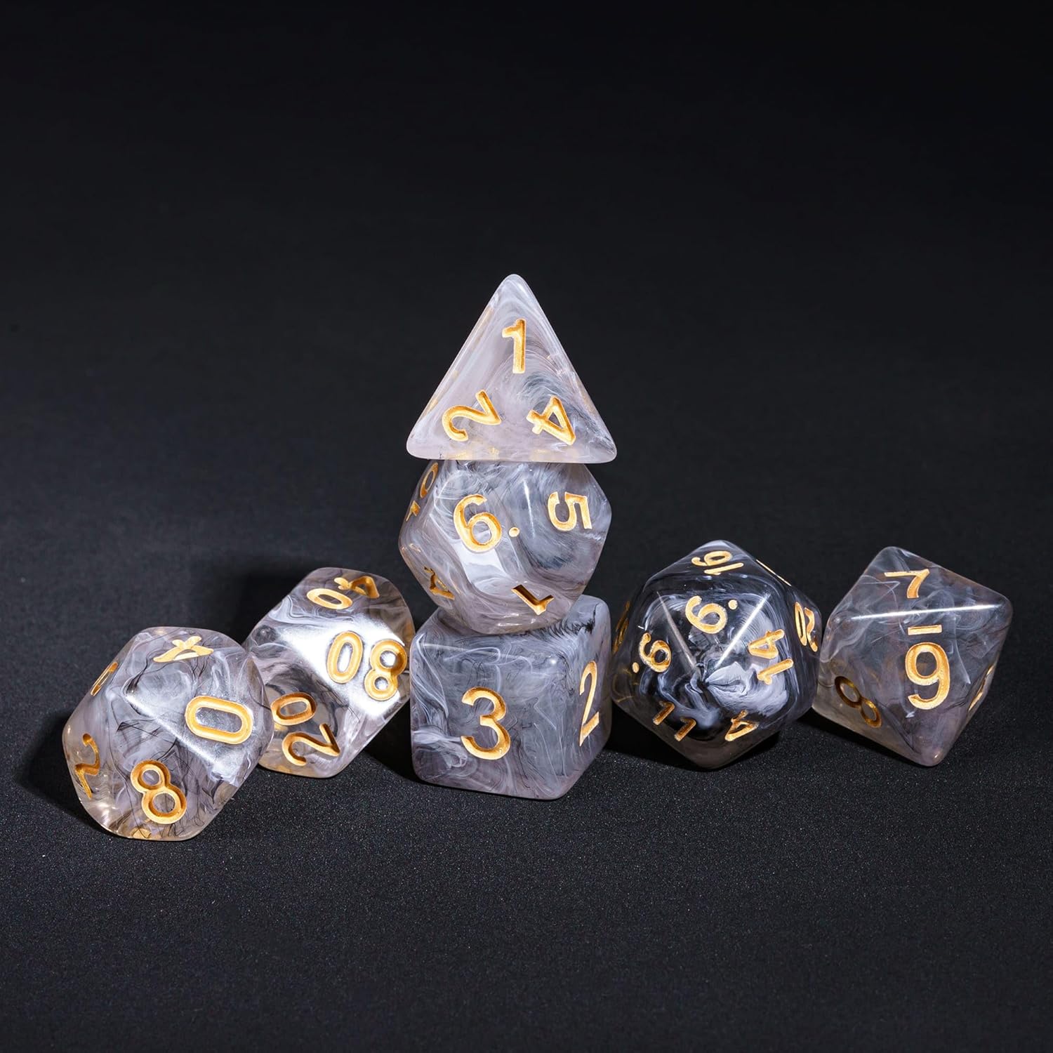 - Exquisite Design:Each dice is carefully sculpted with a transparent black and white mixed brushed effect. When viewed from a distance, it is as unique as a marble-like texture, while a closer look reveals a black and white intertwined brushed effect that flows as lightly as smoke, delivering a strong visual impact. Every detail showcases unparalleled craftsmanship and design, perfectly capturing the changing light and making it a work of art on every D&D player's desktop.