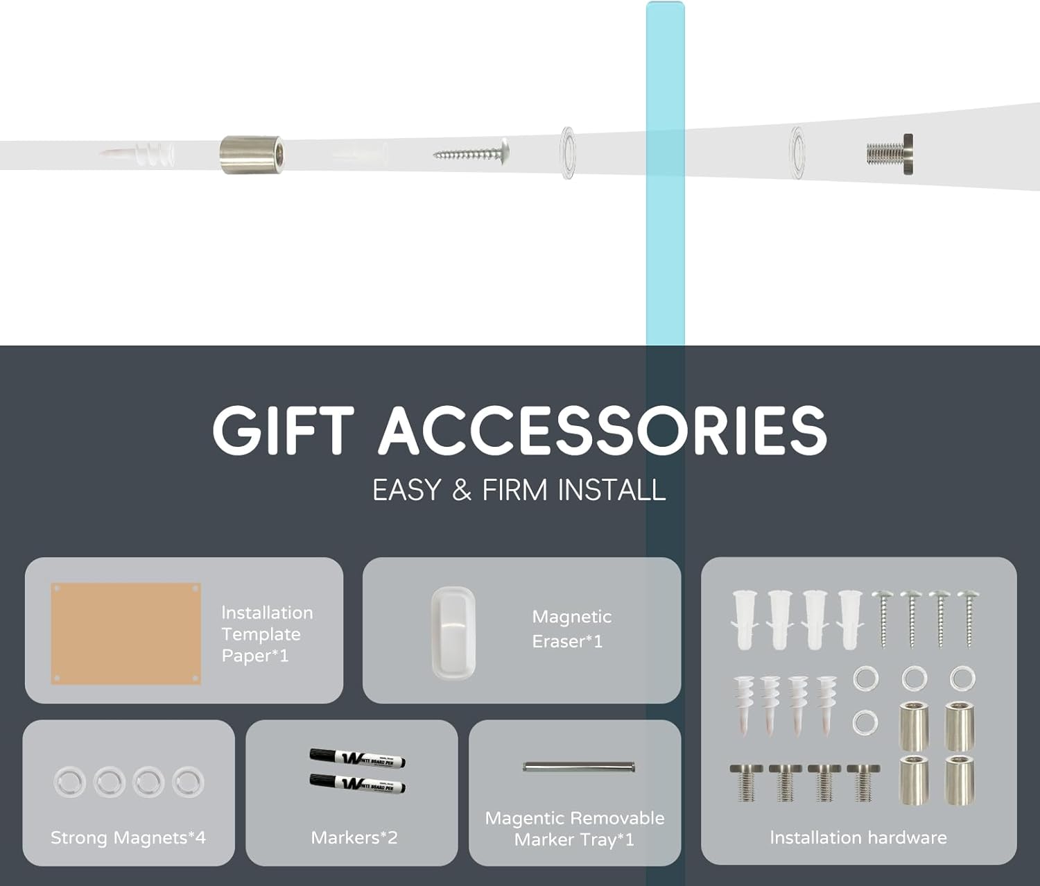 - Effortless Installation: Installing your glass whiteboard is a breeze with our comprehensive mounting kit and step-by-step instructions. The pass-through mounting system allows you to secure the board vertically or horizontally, providing flexibility to fit your specific space and needs.