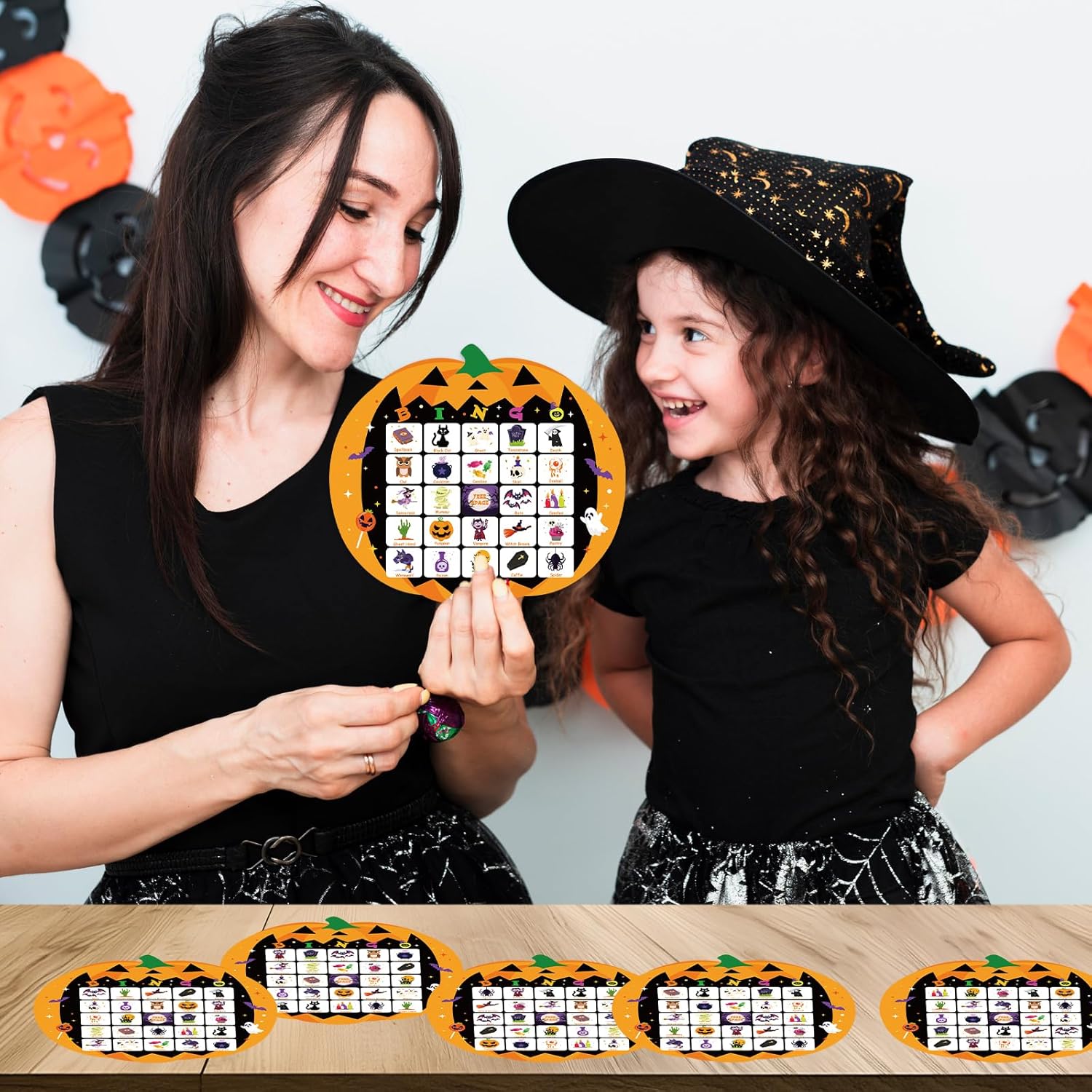 - ALL ACCESSORIES ARE EASY TO USE: The product includes 24 illustrated bingo cards, 25 business cards, 490 themed chips and a play guide. The rules are clear and easy to use, and no complicated preparation is required. Whether it is used as Halloween party supplies, or Halloween gifts or pumpkin party favors given to relatives and friends, it is a fun and practical choice