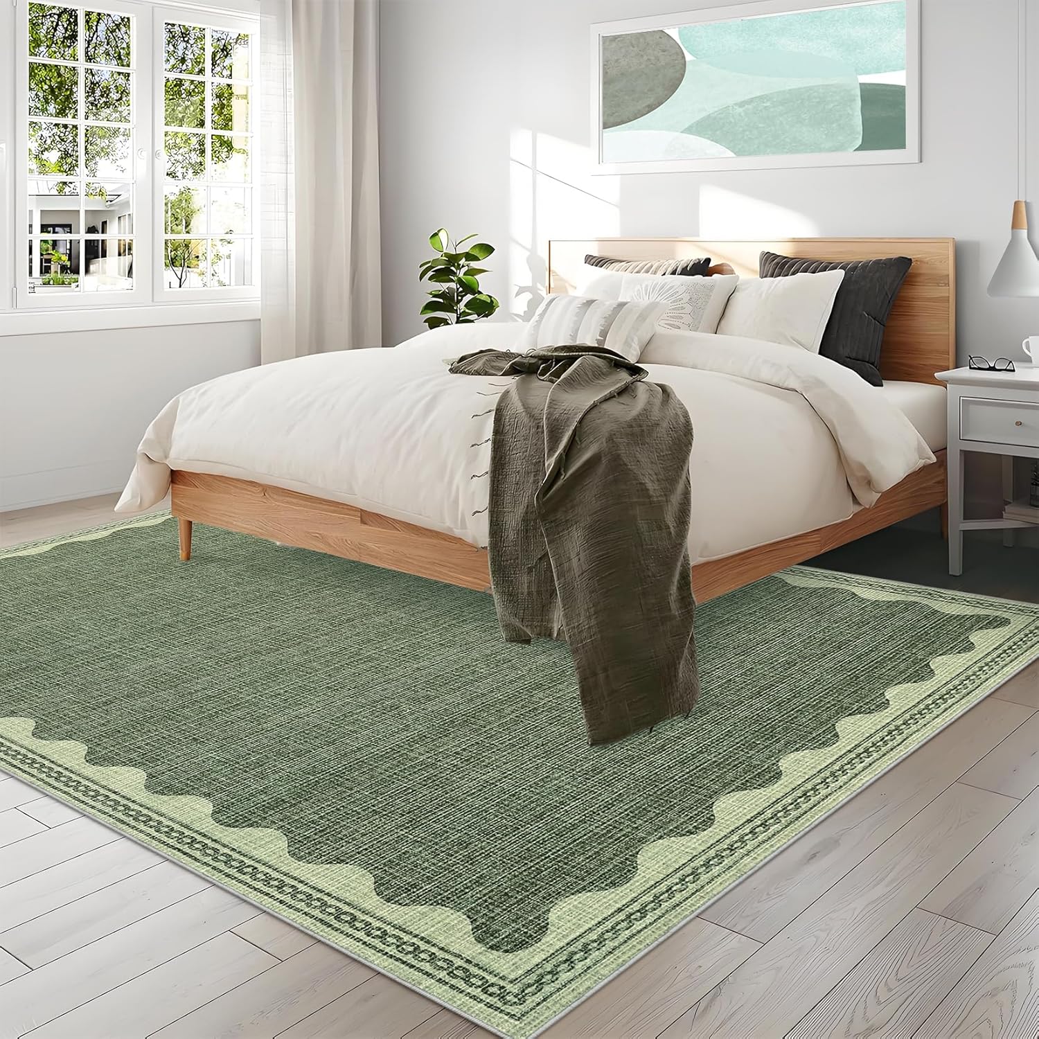 Scalloped Washable Rug 8x10 Area Rugs for Living Room, Solid Green Rug for Bedroom Girls, Non Slip Throw Carpet with Rubber Back, Soft Dorm Nursery 8x10 Rugs for Dining Room