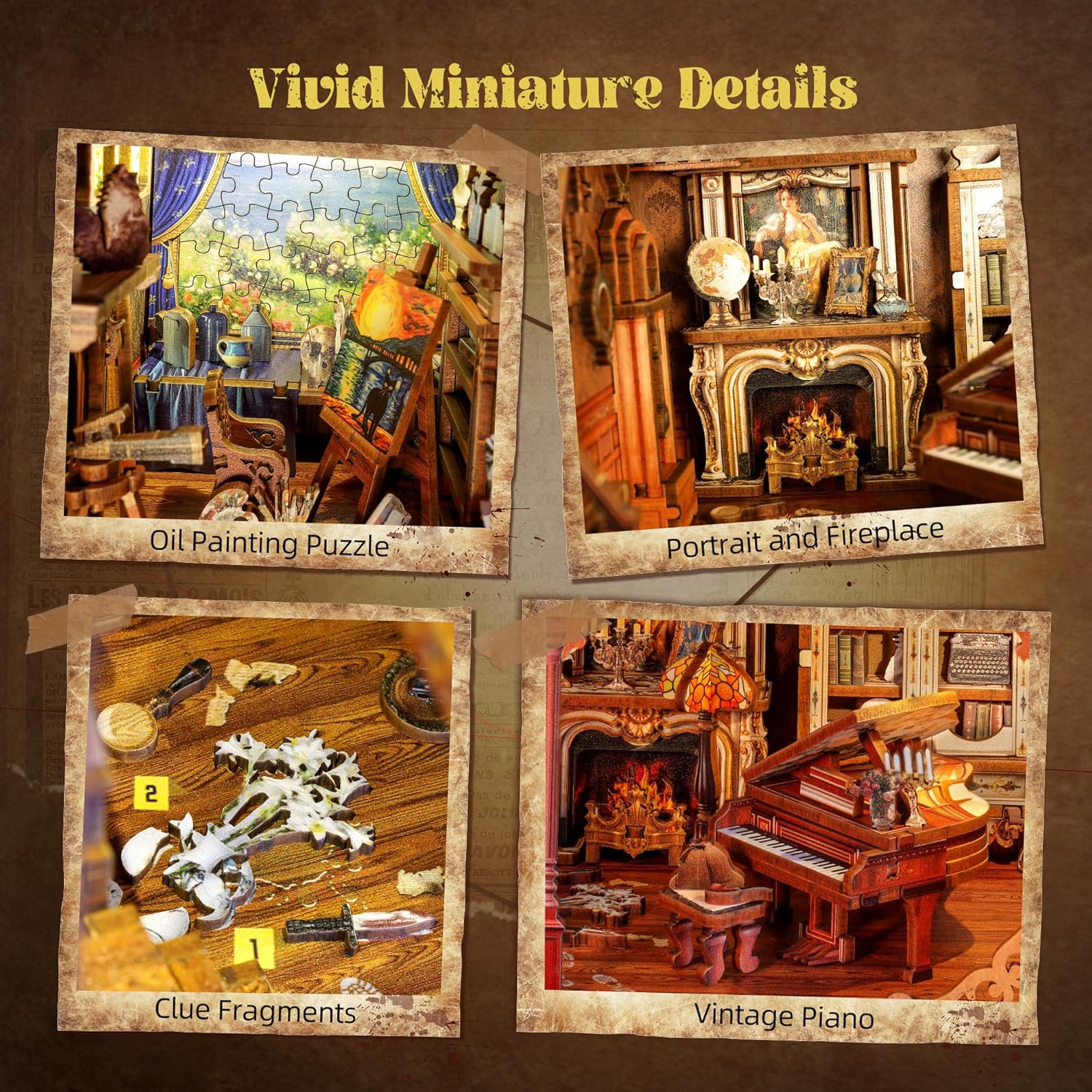- 【Unlock the Mysterious Space with a Stunning Miniature】Step into intrigue with this 3D wooden puzzle book nook, featuring clues like oil painting puzzles, magnifying glasses, knives, and footprints. A suspect’s portrait, vintage fireplace, and antique piano add to the mystery. With LED lights, this book nook turns your bookshelf into an immersive detective story.