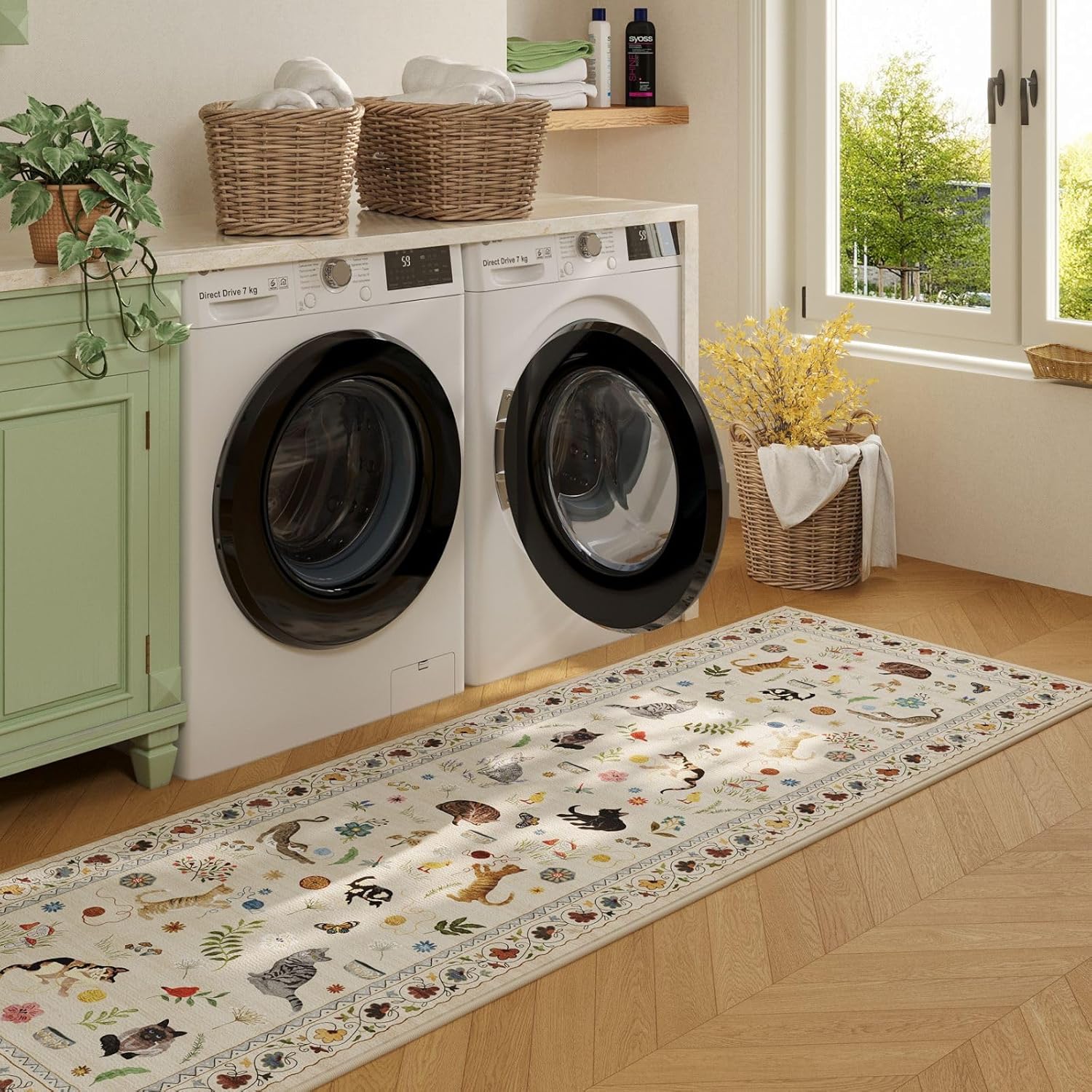 Rugcomf Runners for Kitchen Runner Rug Non Slip 2'x10' Long Washable Rugs with Rubber Backing Soft Floral Animal Cat Carpet Runner for Kitchen Laundry Bedroom Bathroom, Beige