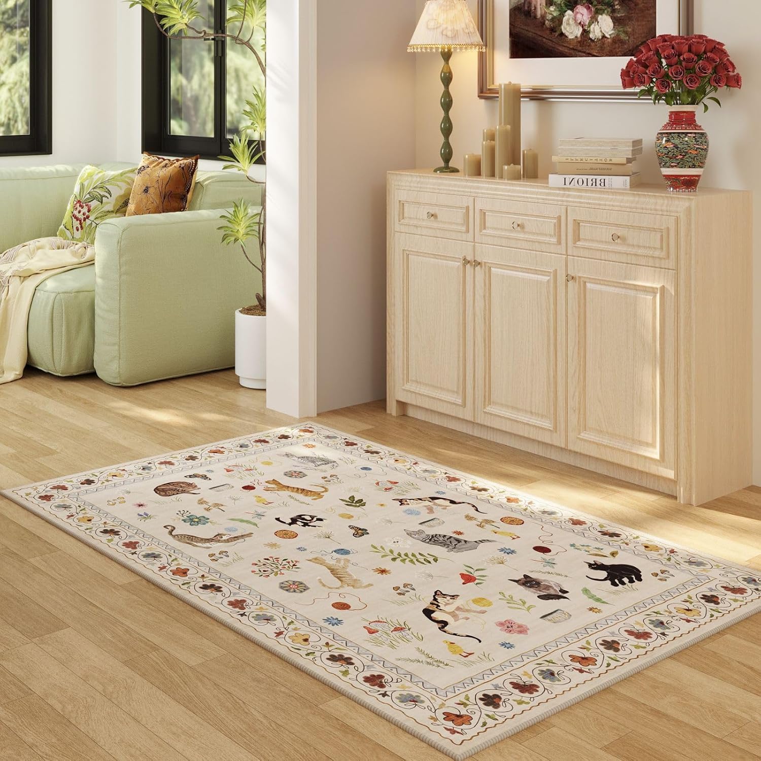 Rugcomf Bedroom Rug 3x5 Rug Washable Area Rug Non Slip Low Pile Boho Floral Animal Cat Small Carpet for Bedroom Bedside Kitchen Entryway Kids Room Office College Dorm Essentials for Girls, Beige
