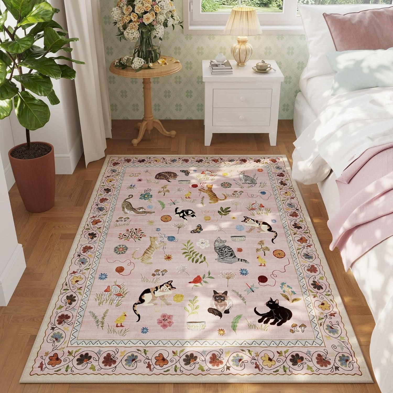 Rugcomf Bedroom Rug 3x5 Rug Washable Area Rug Non Slip Low Pile Boho Floral Animal Cat Small Carpet for Bedroom Bedside Kitchen Entryway Kids Room Office College Dorm Essentials for Girls, Pink