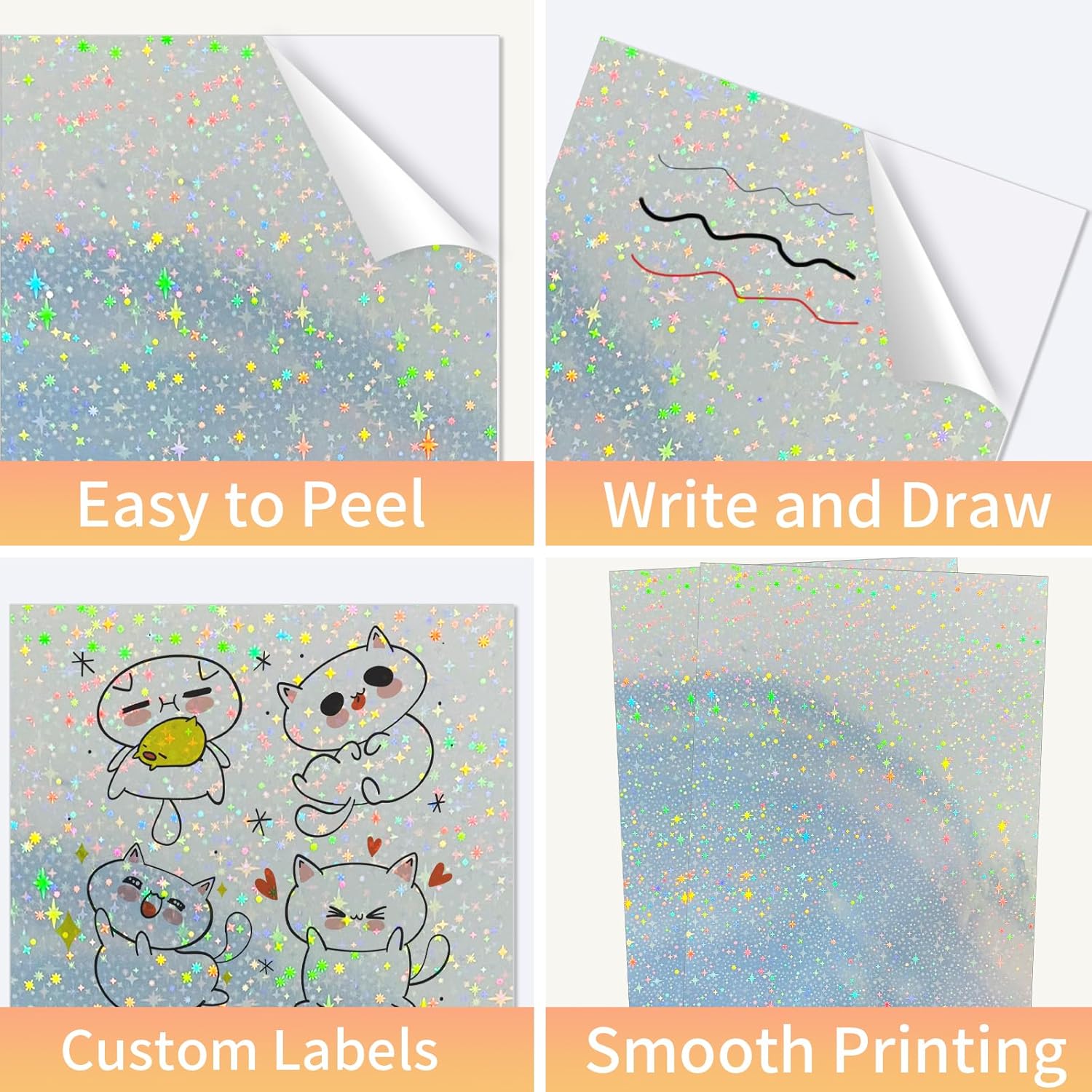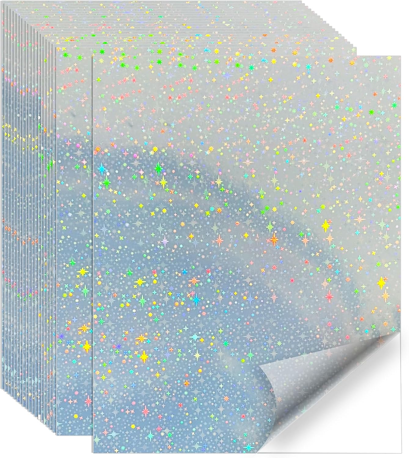 Printable Sticker Paper, 20 Sheets Printable Holographic Star Sticker Paper, Laser/Inkjet Printing- Holographic, Letter Size (8.5" x 11")