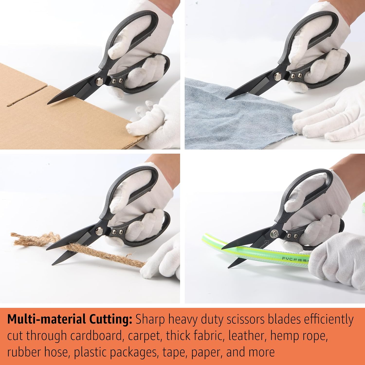- MULTI-MATERIAL CUTTING: Sharp multipurpose heavy duty scissors blades efficiently cut through cardboard, carpet, rug, thick fabric, leather, hemp rope, rubber, plastic packages, tape, paper, and more