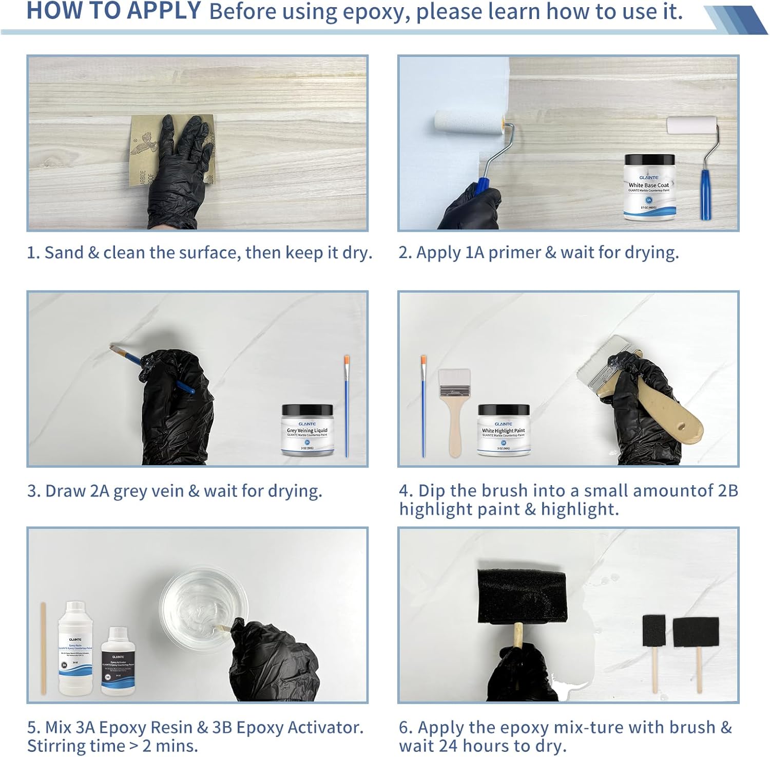 - SAFE & SUSTAINABLE: GLAINTE marble countertop paints are formulated with high-quality water-based paint that is low-odor, non-toxic, and water-based. Suitable for flat and smooth surfaces such as wood, tiles, etc. Achieve the luxurious look of marble in just one weekend. NOTE: If bubbles appear when applying epoxy, use a black sponge brush to reapply, or use a sharp tool to pierce them. DIY production can not be perfect; please understand
