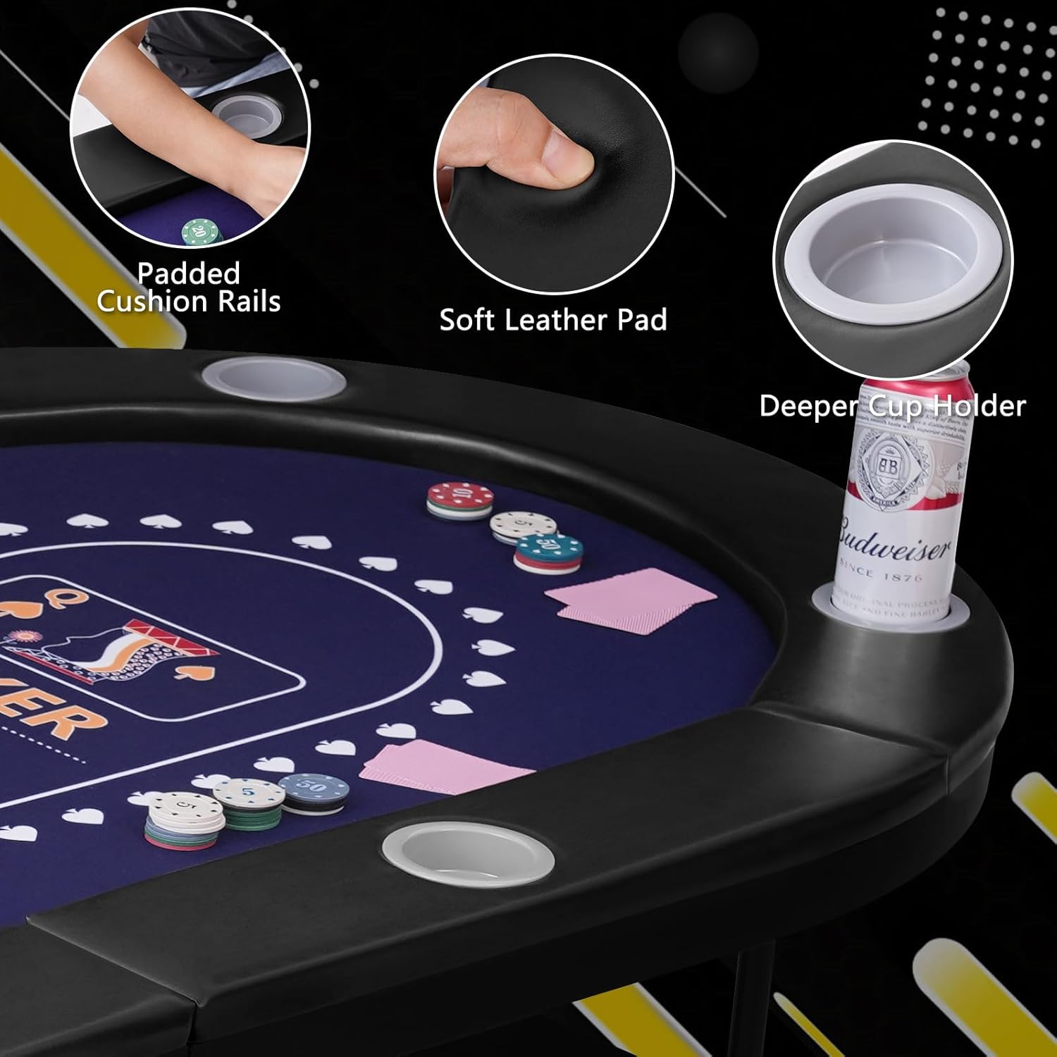 - 8 Player Poker Table: Designed for Texas Holdβem, Blackjack, and other card games, this foldable poker table is 71"L x 35.5"W x 30"H and can accommodate 8 players, making it perfect for family game nights, friendly tournaments, or casino-themed parties.