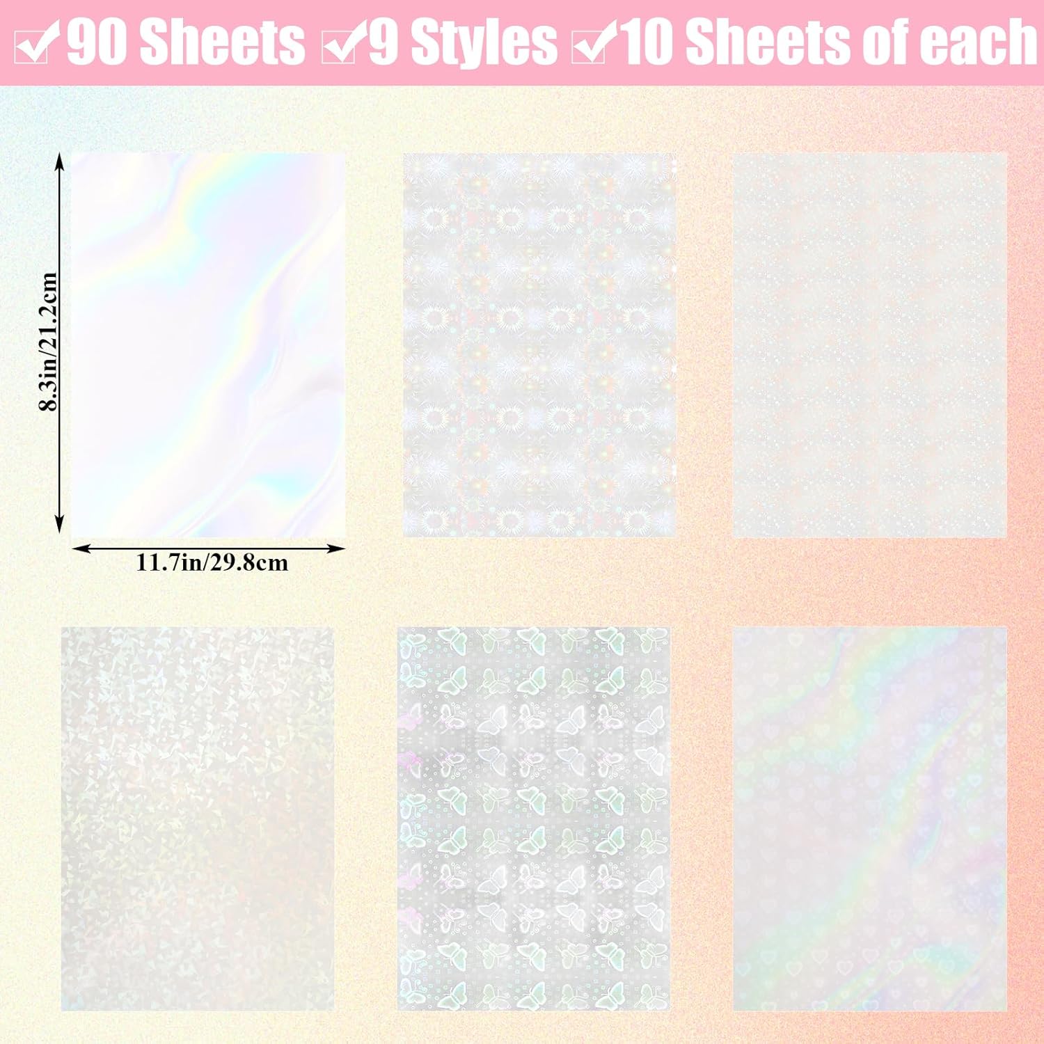 STARVAST 90 Sheets Holographic Sticker Paper, Transparent Holographic Vinyl Laminate Sheets, Self Adhesive A4 Size Printable Holographic Paper with Gem Rainbow Spot Star Patterns