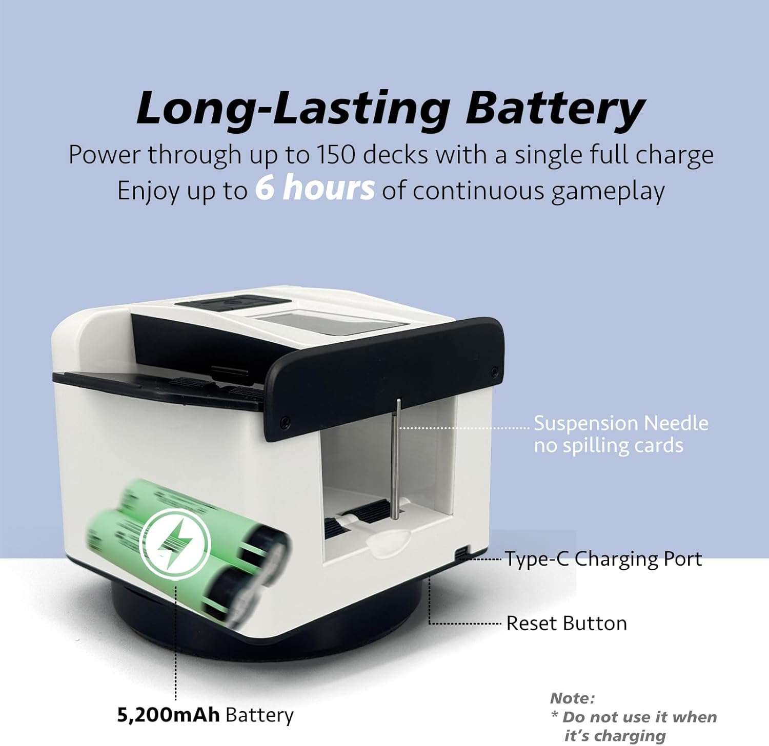 - Quiet Operation: Equipped with a low-noise motor, it ensures a peaceful gaming environment; You can enjoy long game sessions without the annoying noise that some other shufflers and dealers produce