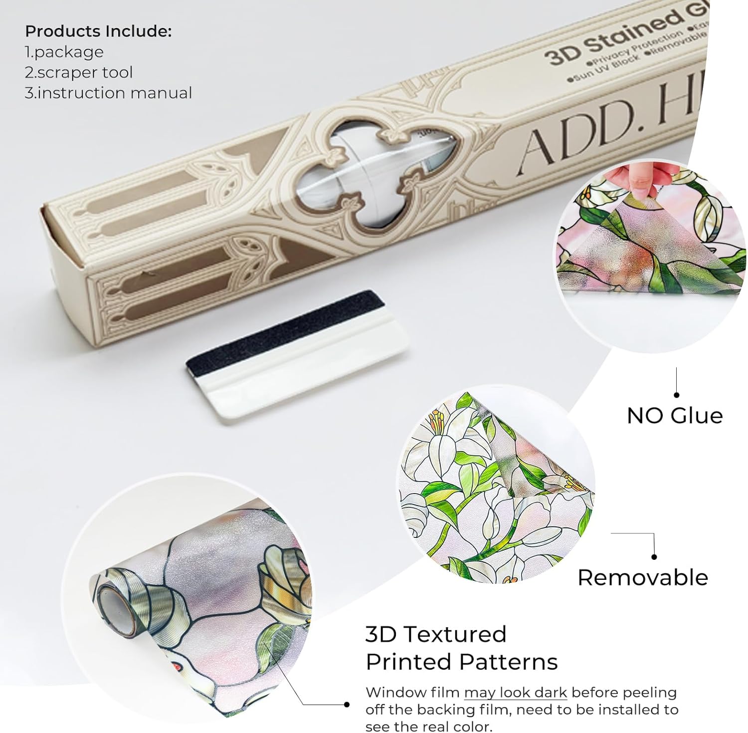 - Easy Installation and Adhesive-Free - Our stain glass film installs easily, no glue needed. Just measure, cut, and apply with water on clean glass. It's residue-free for easy repositioning or removal whenever you want a new look.