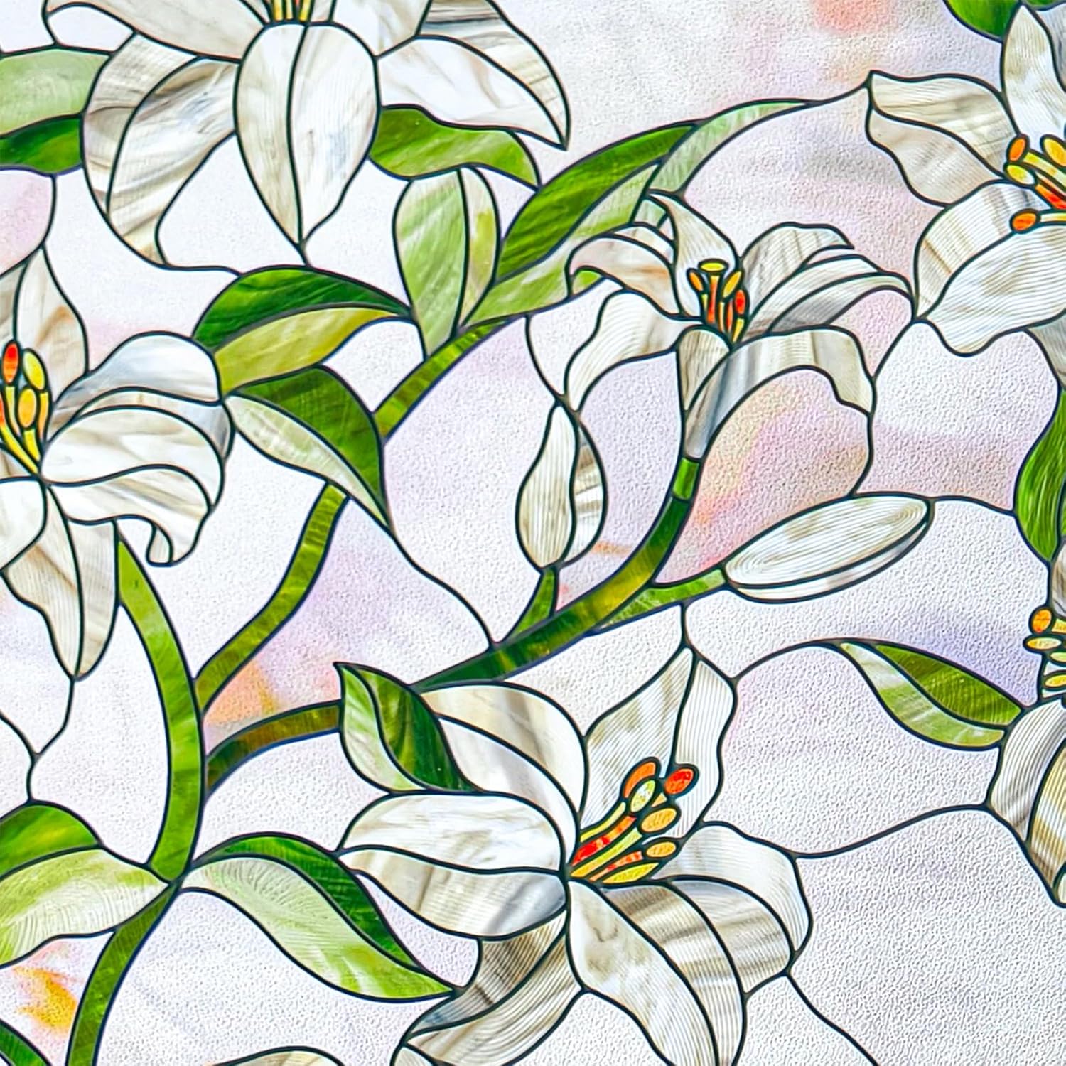 - White Lily -This window film design is inspired by a tranquil secret garden, where white lilies bloom under the spring sunlight, symbolizing purity and renewal. The soft pink background adds warmth and serenity, evoking the peace and beauty of nature.