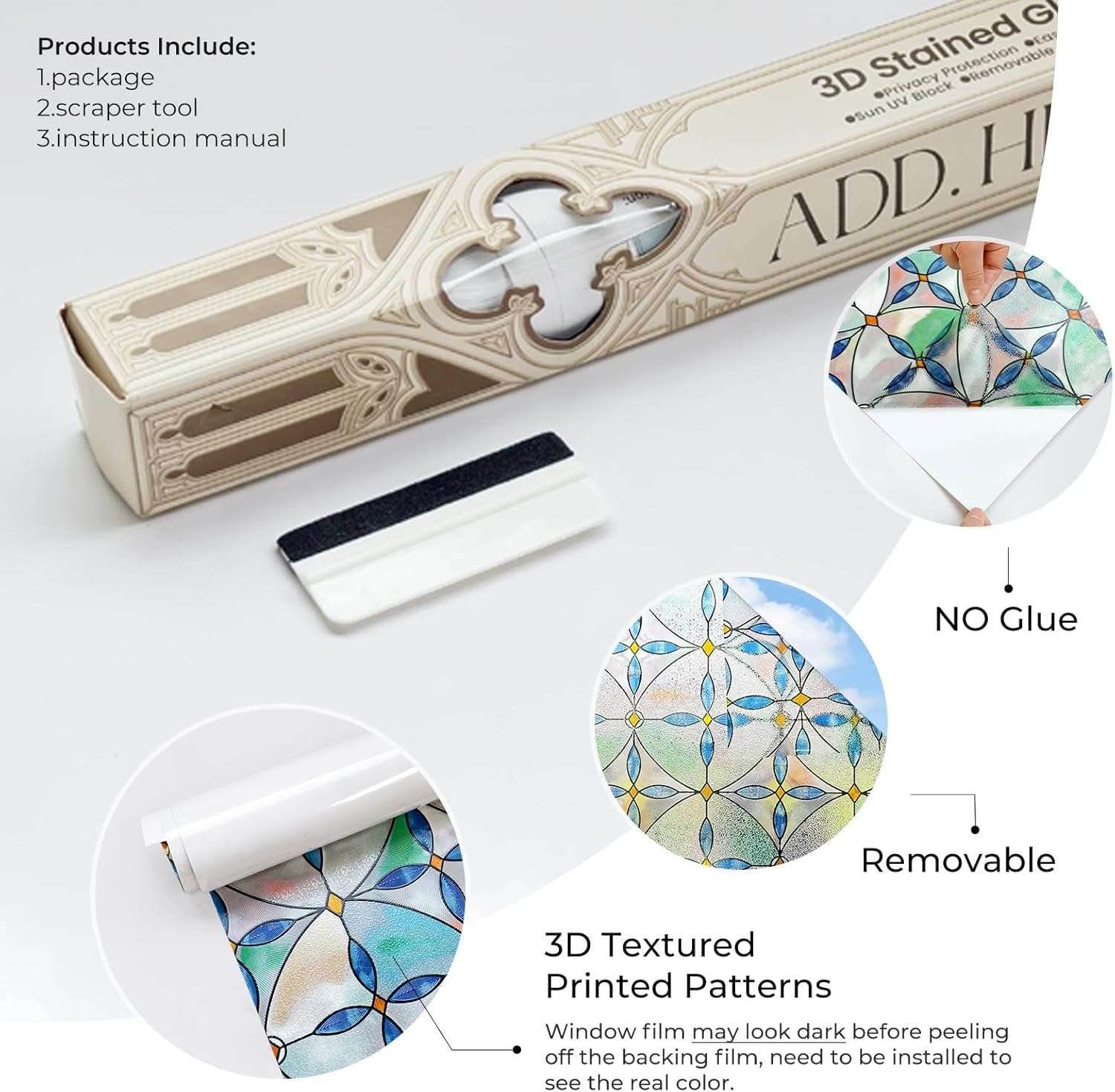 - Easy Installation and Adhesive-Free -Our stain glass film installs easily, no glue needed. Just measure, cut, and apply with water on clean glass. It's residue-free for easy repositioning or removal whenever you want a new look.