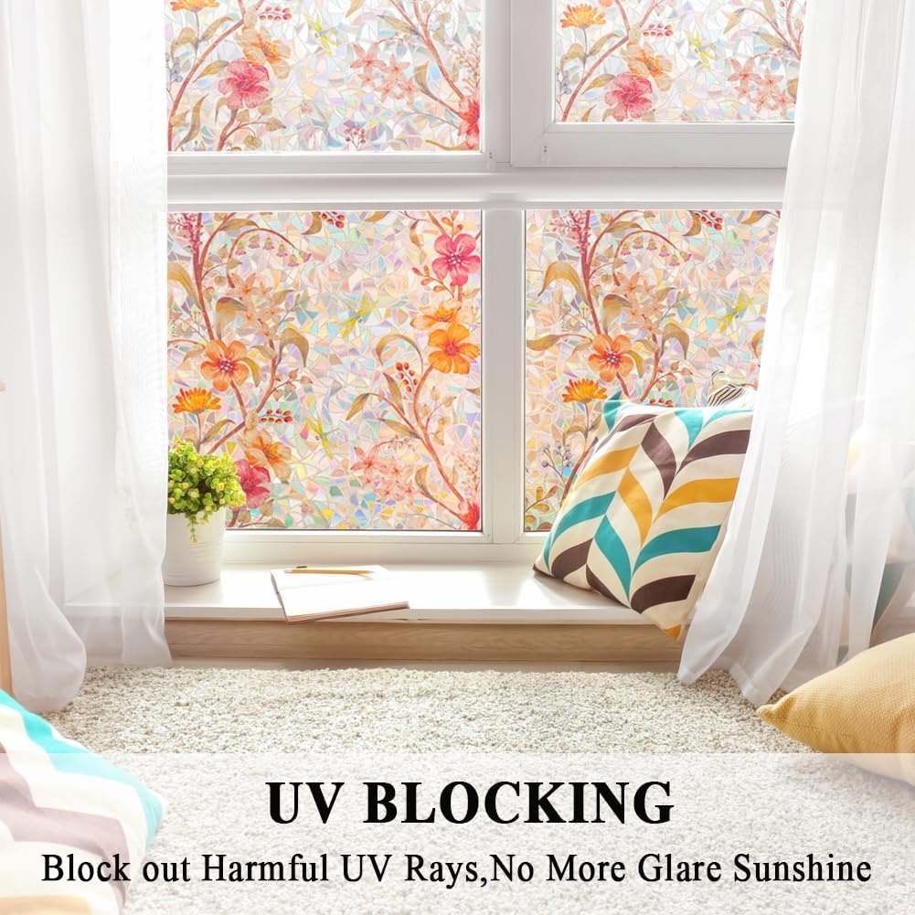Stained Glass Window Film Static Cling Door Privacy Film Decorative Flowers Red Leaves Window Decals Stickers Heat Control Anti UV for Home and Office,23.6 inches by 78.7 inches