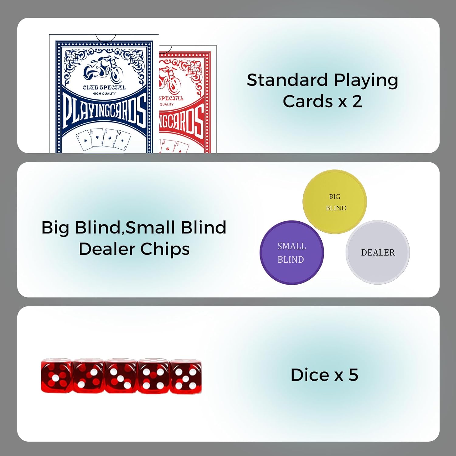 - Expertly Denominated Chip Breakdown and Accessories: $1-white(150 Chips), $5gold(150 Chips), $25-pink(100 Chips), $100-blue(50 Chips), $500-purple(25 Chips), $1000green(25 Chips), Professional Poker Accessories, Dice*5, Casino Level Poker Decks*2, Deluxe Dealer Button*3