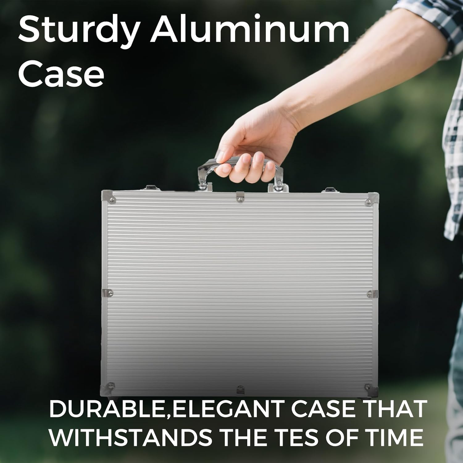 - Portable Aluminum Case: Embrace mobility with our Premium aluminum case. Reinforced corners ensure sturdiness, while dual latches secure your Poker essentials. With compartments for organized storage and a swivel handle for convenience, this case is your Flawless Poker companion