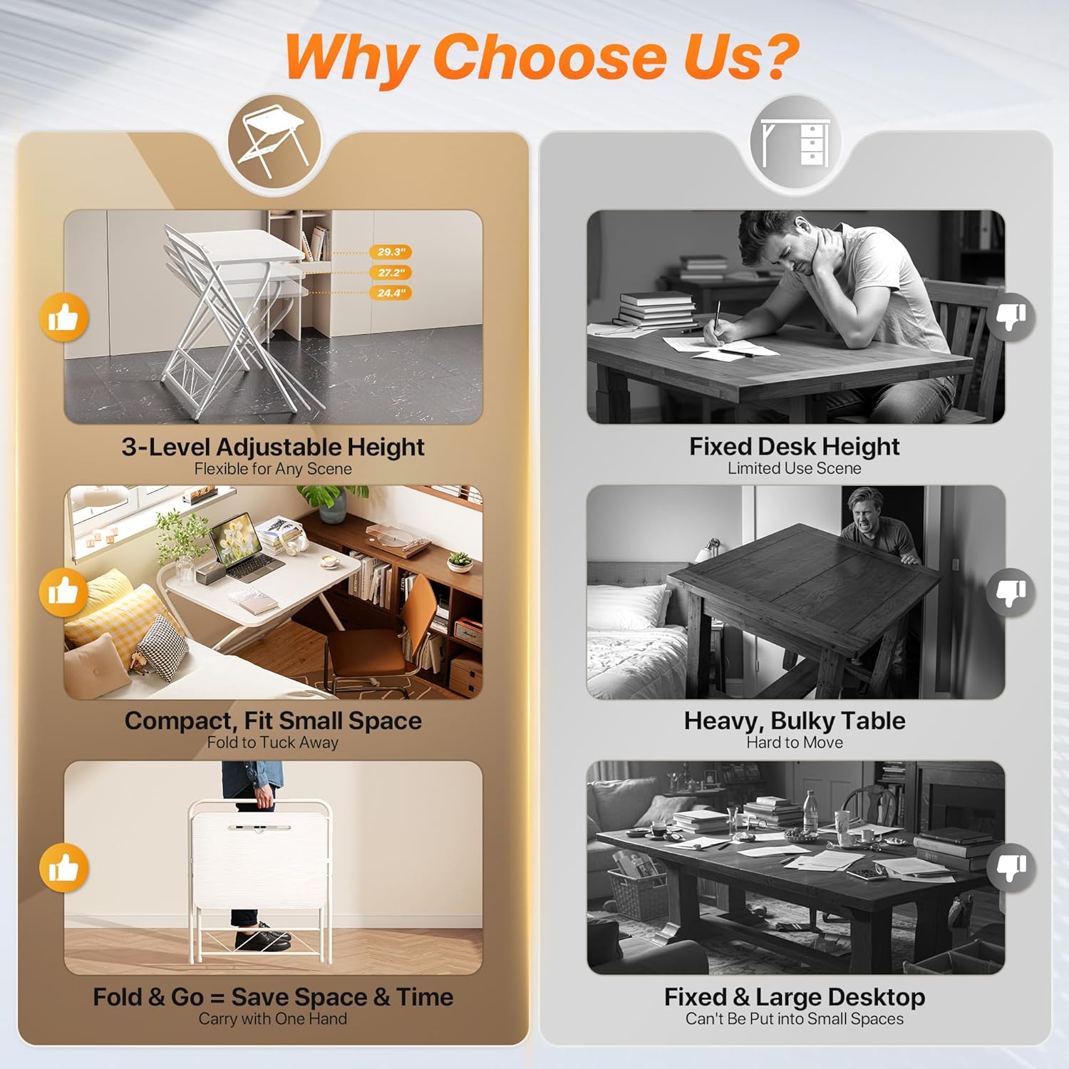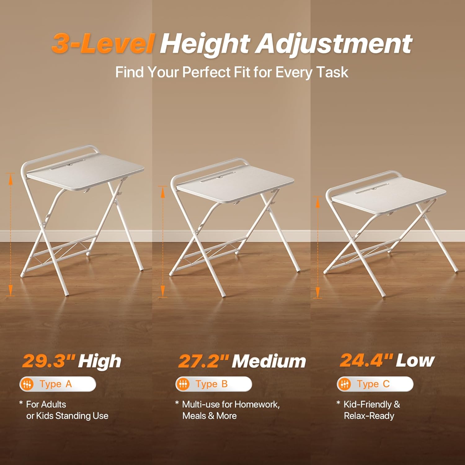 - ăAdjustable Height with Safety LockăThis foldable desk features 3 height options (24.4"/27.2"/29.3") with a secure anti-pinch safety lock, making it easy to adjust for users of all sizes. Whether it's for kids, teens, or adults, everyone can find a comfortable height for studying, working, drawing, or even outdoor use. The handle allows for effortless lifting and setup, safe, smooth, and convenient for the whole family
