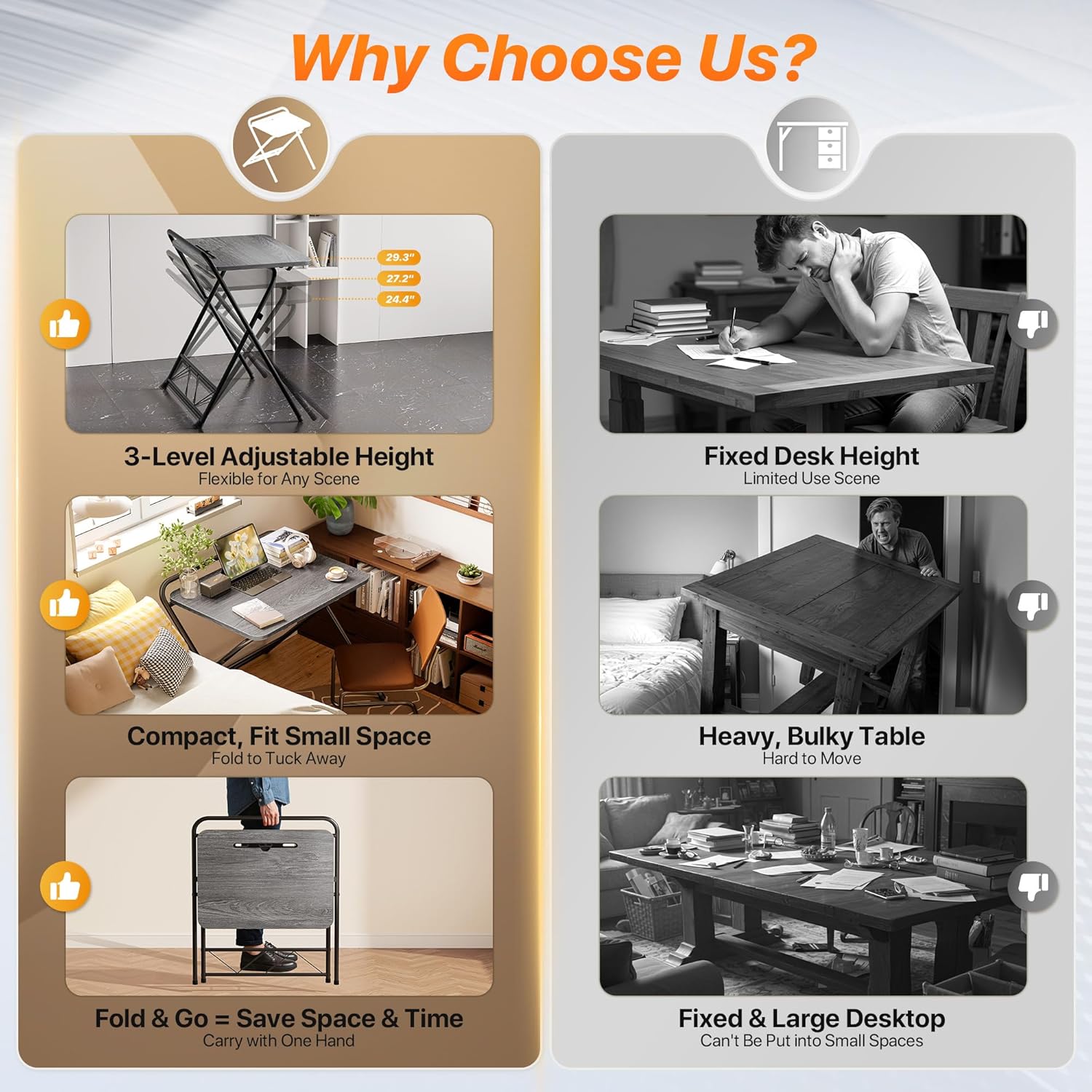 - ăSturdy & Durable BuildăStrong steel frame, adjustable feet, and cross-leg design of the portable folding desk provide exceptional stability. The water-resistant, scratch-resistant tabletop blends seamlessly with any home decor â perfect for bedrooms, apartments, RVs, offices, and more