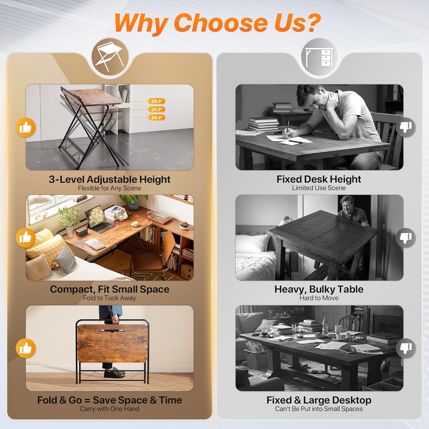 - ăSturdy & Durable BuildăStrong steel frame, adjustable feet, and cross-leg design of the portable folding desk provide exceptional stability. The water-resistant, scratch-resistant tabletop blends seamlessly with any home decor â perfect for bedrooms, apartments, RVs, offices, and more