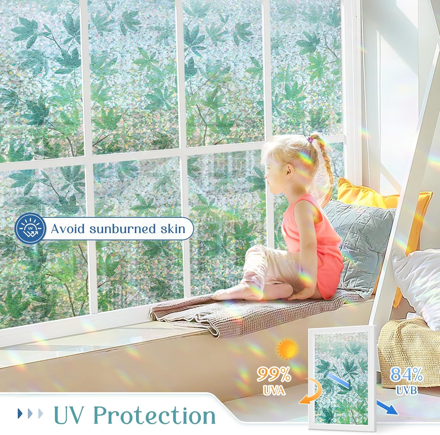 Haton Window Privacy Film, Decorative Stained Glass Window Clings, 3D UV Sun Blocking Sticker, Removable Static Cling Heat Control Tint for Home Door, Leaf Rainbow, 23.6" x 157.4" Non-Adhesive