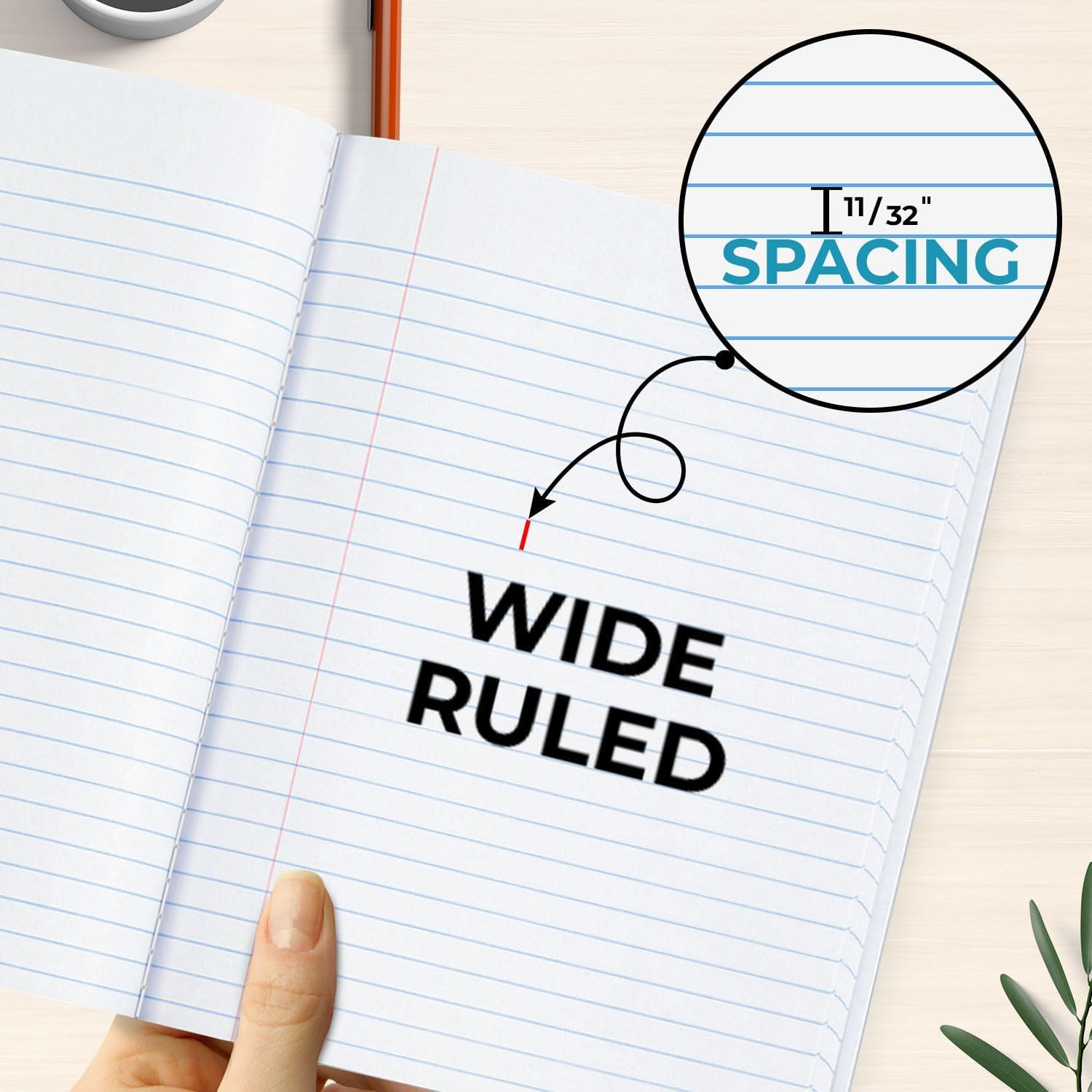 - PREMIUM WIDE-RULED PAGES: Each 7.5" x 9.75" notebook features wide ruled, bleed resistant paper, perfect for pencils, pens, and highlighters. The wider spacing helps younger students, teachers, and professionals maintain neat and organized notes.