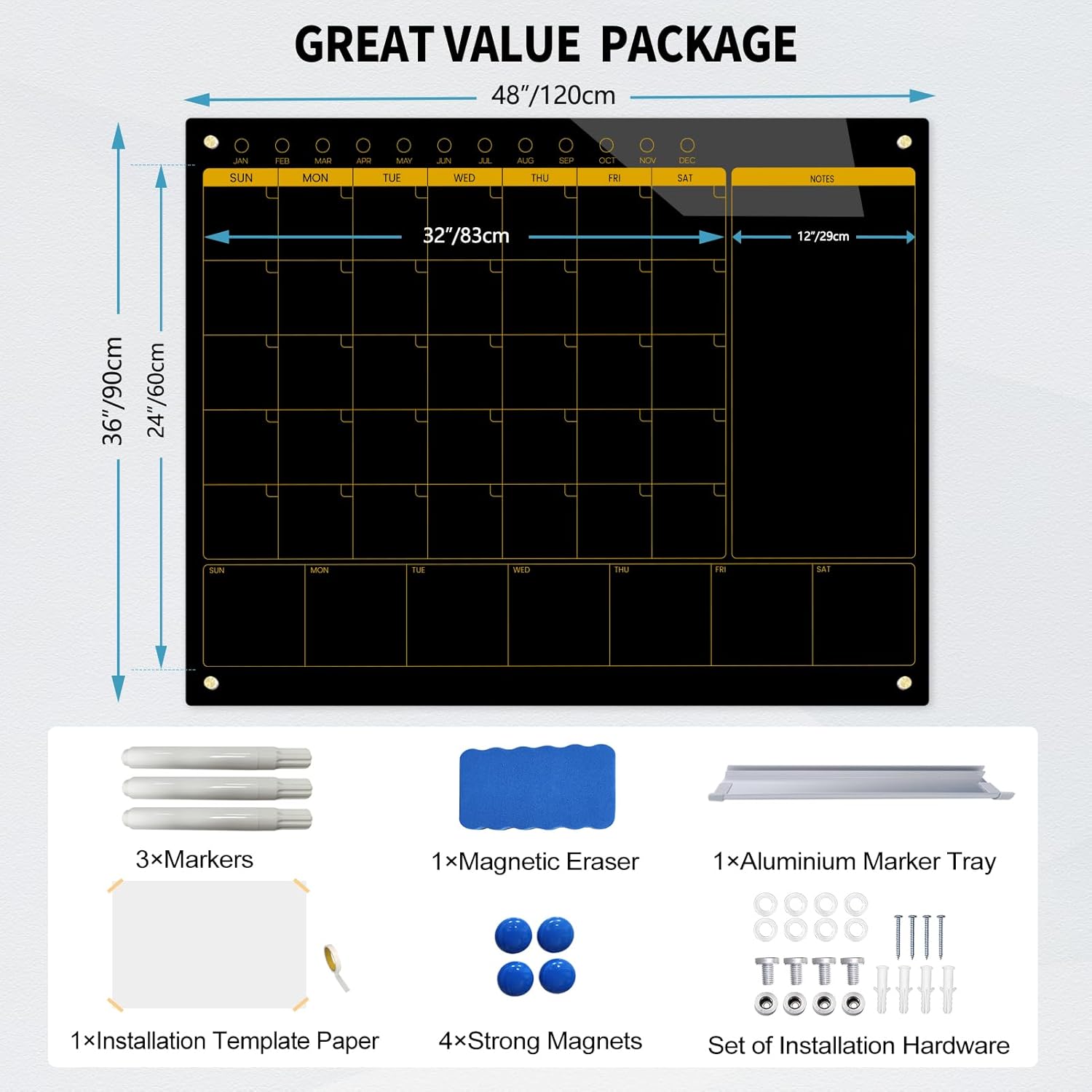 Magnetic Glass Blackboard Calendar 48"x36" Monthly Glass Dry Erase Board for Wall Planner GlassBlack Board Calender Wall Mounted for Office School Home(Black)