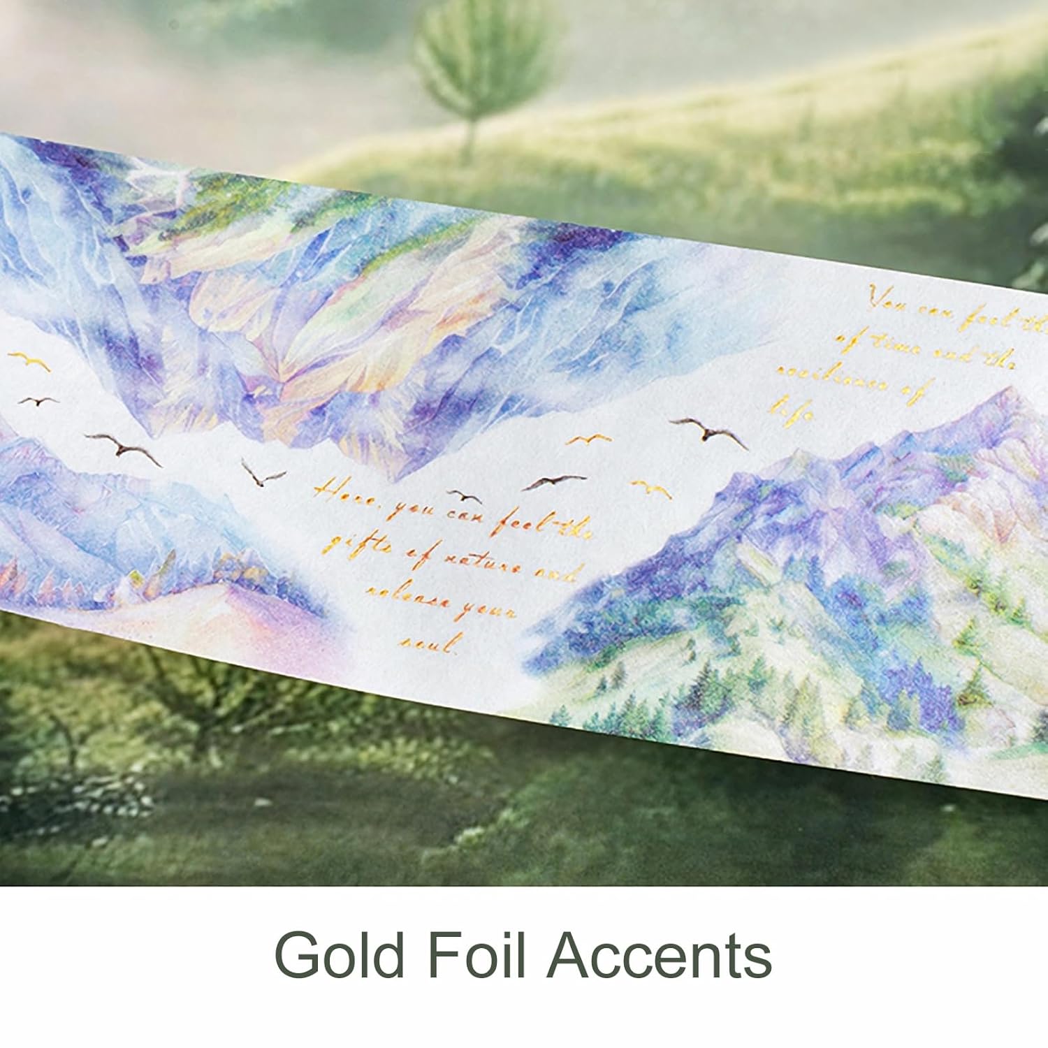 - Scenic Nature Designs: Features 6 washi rolls with poetic forest, mountain, and seasonal themes, enhanced by delicate text. Brings immersive calm and visual poetry to journals and scrapbooks