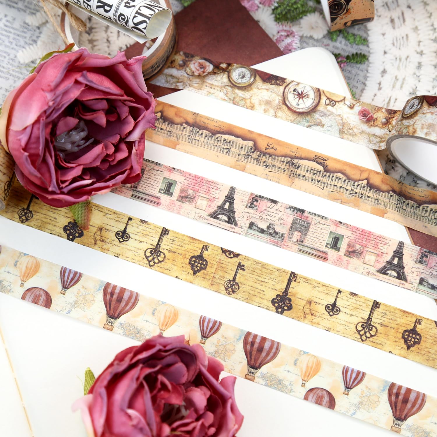 - Vintage Design: Original selected design 16 different vintage travel theme tapes, inspired by the vintage era, each roll is a time capsule: posters, maps, architecture, voyages, coffee, cameras, and hot air balloons. These patterns arenโt merely decorative; theyโre tactile bridges connecting modern crafters to the romance of remembering, inviting users to layer history into every journal entry, gift wrap, and memory-keeping project. Every millimeter whispers tales of journeys past while empowering new creative voyages.