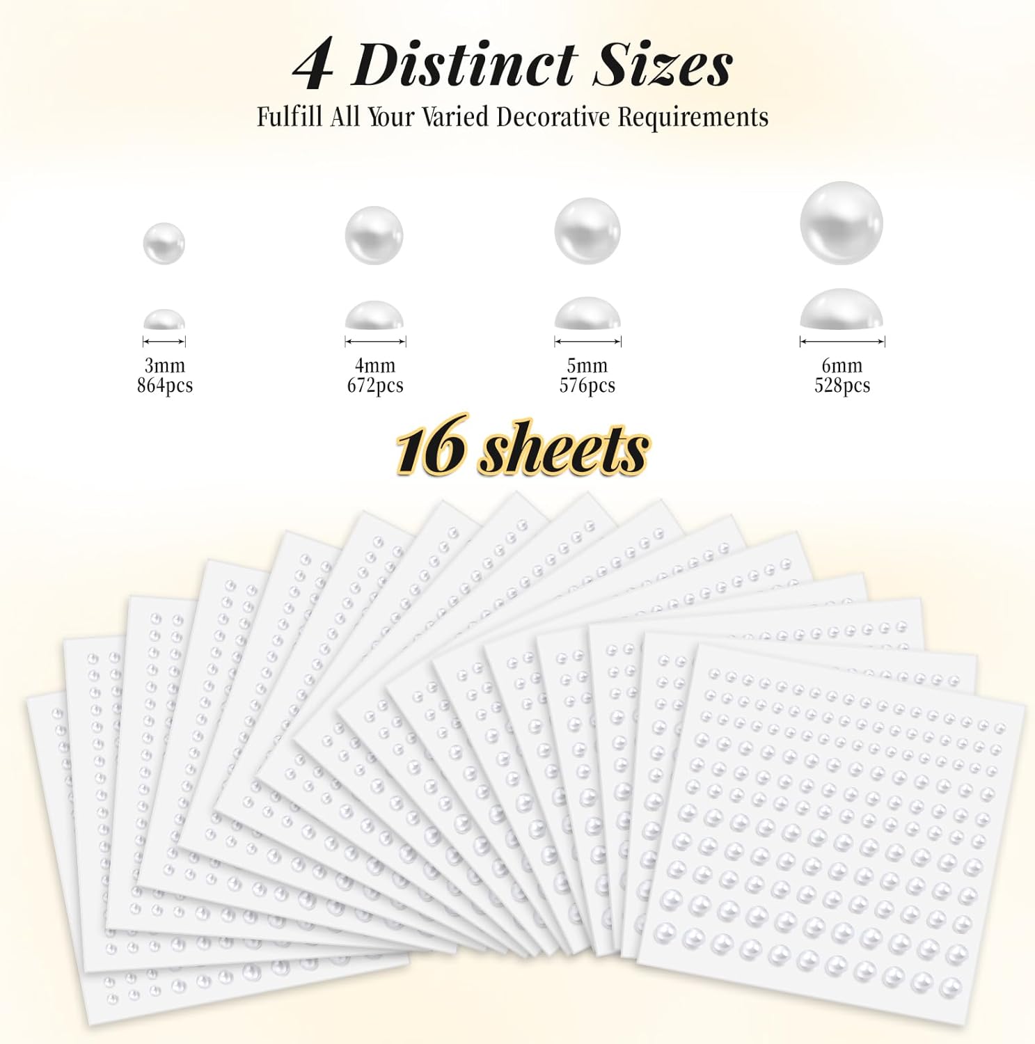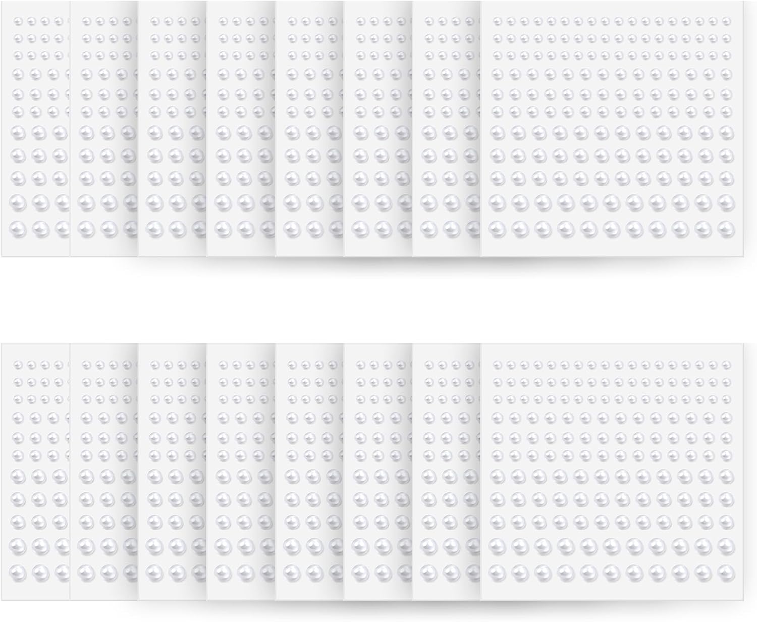 - Multi-size combination:Each sheet comes in four sizes of flat back pearls, 3mm/4mm/5mm/6mm (0.12 inch /0.16 inch /0.2 inch /0.24 inch), the number and size are enough to satisfy you the demand of all kinds of make-up and craft project