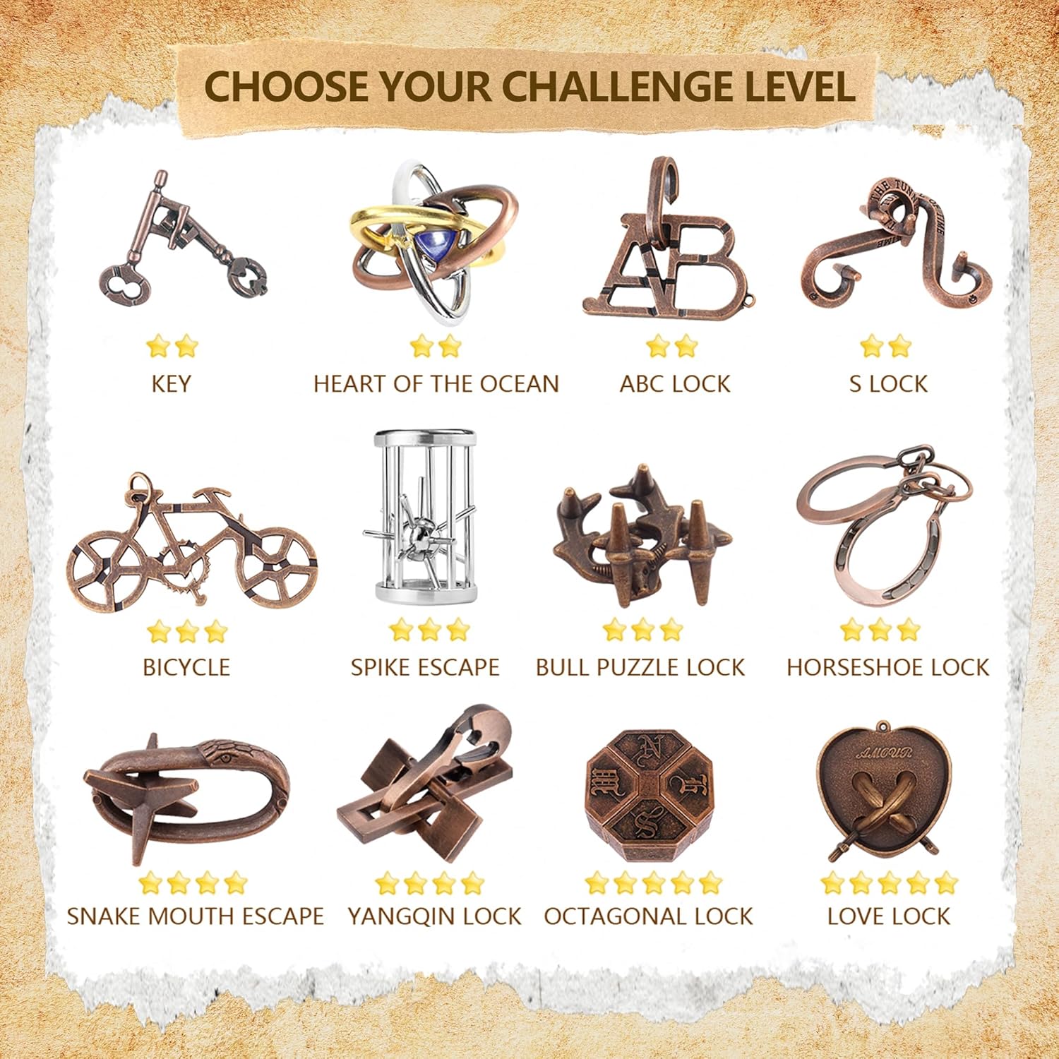 - 【12 Pcs Brain Teaser Puzzle Set】This set includes 12 different 3D metal puzzles, each with its own unique design and difficulty level. Perfect for those who love a good challenge, these logic puzzles help enhance problem-solving skills, concentration, and patience(For a smooth unlocking experience, we've included a detailed video guide demonstrating the solution process for each puzzle. Please check the product videos section below the images!)