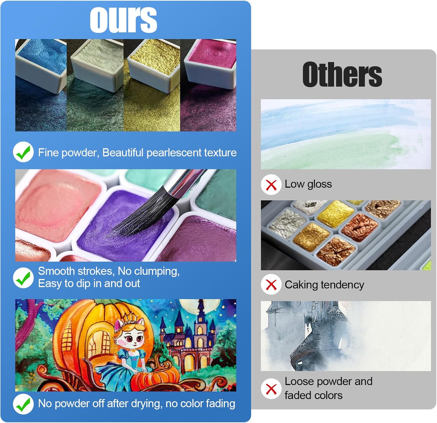 - 【Smooth Strokes, No Powder Off After Drying】: Our watercolor paints are fine powder with smooth strokes that won't clump. The powder will not fall off after drying, making the artwork shine forever